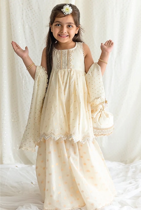 For little girls, move away from the usual frock and go for a light Sharara Set like the one by label Chotibuti in ivory.