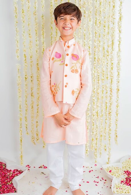 A pastel kurta set with a jacket is ideal festive wear for little boys who want to play around without any hindrance. Check out the light pink Bundi Jacket with Kurta Set from MR BRAT, which features a lovely floral print.