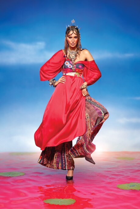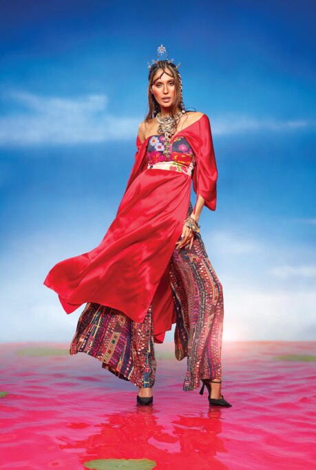 SC: I think Ujjwala and I were on the same page from the beginning. We’ve known each other for a few years and understand what we bring to the table. It was even during fittings when, in one of her first looks, we made her try a jacket; it didn’t work, and she was like, you know, let’s tuck it in, let’s see what happens. So, she completely partnered on this. And Jatin had just said two words to me – have fun. In one of the shots, I’ve draped a saree as a gown. And Ujjwala was very open to it. We did like a pair of Patiala-ish pyjama pants with a choli, and she was very open to that, too. There were no questions about why are we doing this. We both agreed on almost everything. So yeah, I think it was important that we were on the same page and the aesthetics didn’t kind of fight each other. I was super happy working with her.