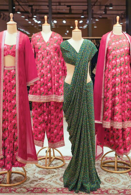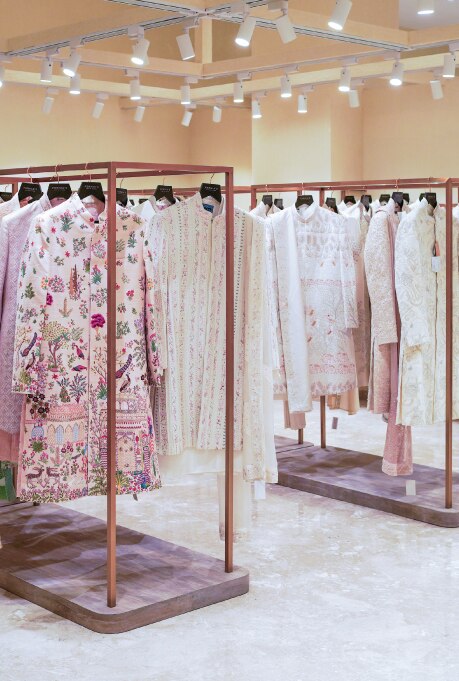 The highest level of the store is quite literally a cherry on the top with an ambient bridal studio. Comprising private salons complete with plush furnishings and trial rooms, this floor is designed to offer a highly personalised and integrated bridal shopping experience. The journey is further enhanced with the help of qualified in-house stylists who make wedding shopping feel like a breeze. While each piece is adorned with age-old craftsmanship, the silhouettes include both traditional and contemporary options, thoughtfully curated for modern brides and their unique sensibilities.