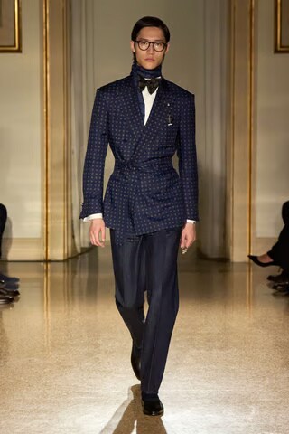 True to Holloway’s vision, the collection stood apart from trend-driven narratives, focusing on refinement through cut and fabrication. For Fall/Winter 2025, he looked to the English Drape Suit, or London Cut, a 1930s silhouette defined by fluid lines, a softly structured shoulder, and a nipped waist.