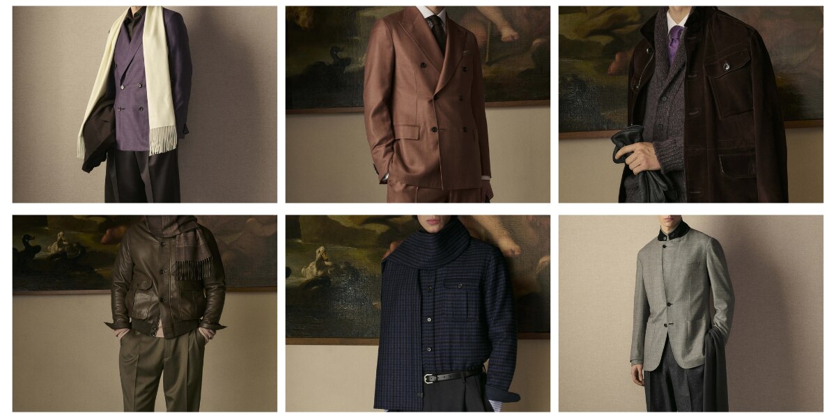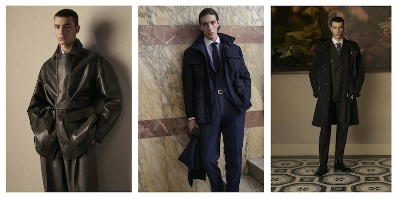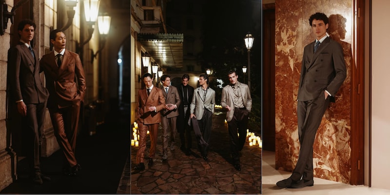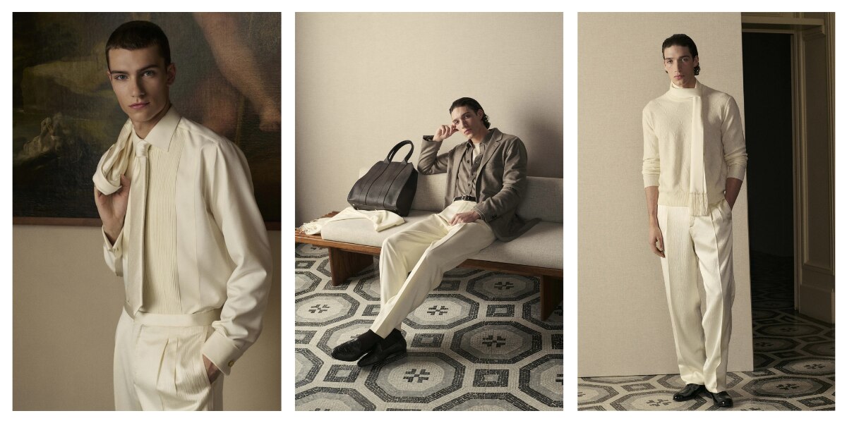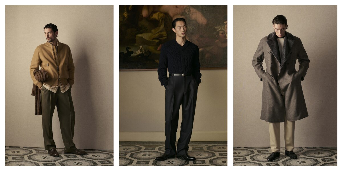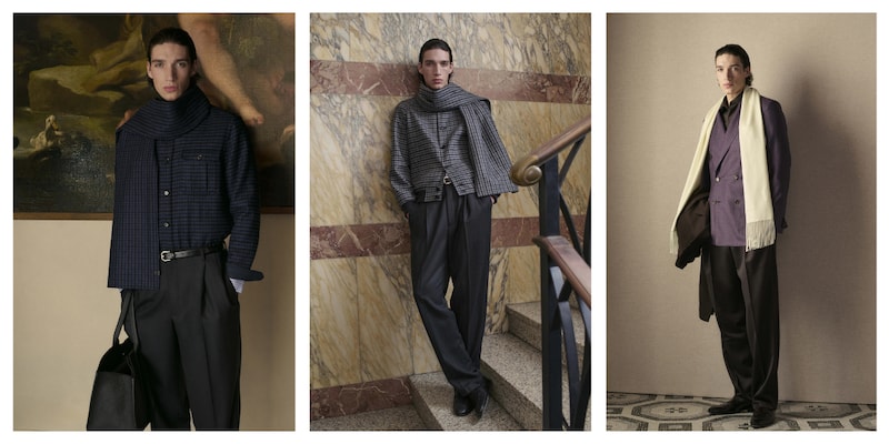 Tailoring remains central, but it is lighter, relaxed, and rebalanced to reflect contemporary rhythms. Jackets are soft but still structured. Trousers are fluid and comfortable. Knitwear blends easily into tailored looks instead of sitting apart from them. Across suits, separates, and outerwear, the mood is calm, with no sharp contrasts or forced statements.