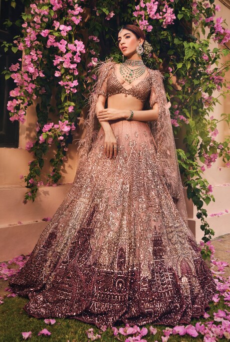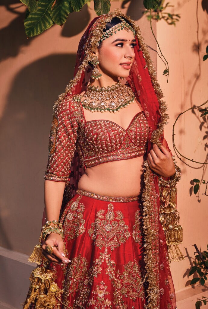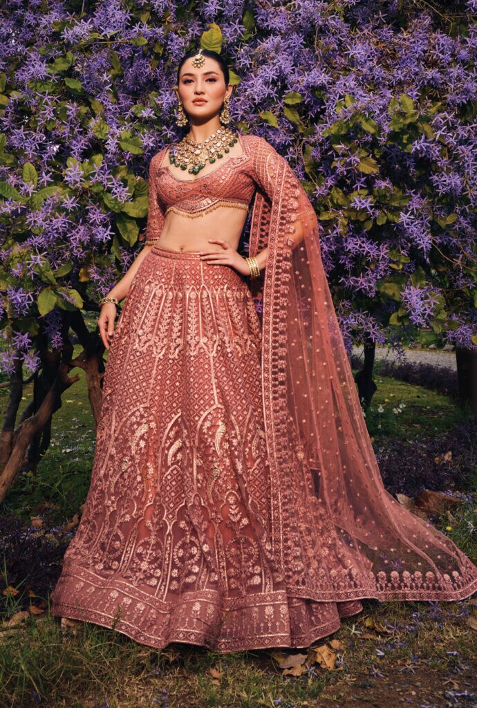 Unlock the true potential of your lehenga adorned with exquisite metallic accents. Select shades that perfectly complement the attire; opt for a subdued eyeshadow with a slight blush, and complete your look with deeper lipstick and a hint of gloss.
