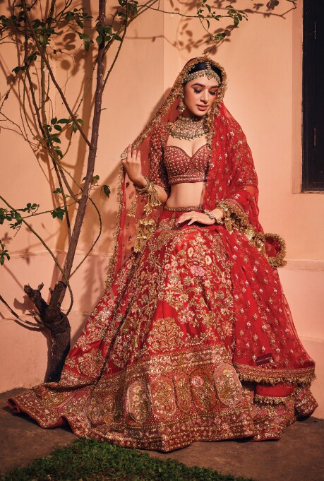 Red-the bold hue synonymous with Indian weddings is always the perfect choice. To complement a modern ensemble, go for a muted look that comprises soft shimmery eye shadow and a peach tone for the cheeks and lips. But when it comes to your hair, go global with a shade of burgundy that complements your skin tone and watch the look come alive.