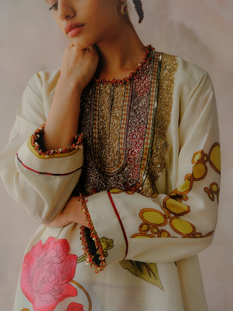“For me, the fun of designing is deciding which elements pair best with Kalamkari, especially the bright florals and layered embroideries that bring this collection to life.”