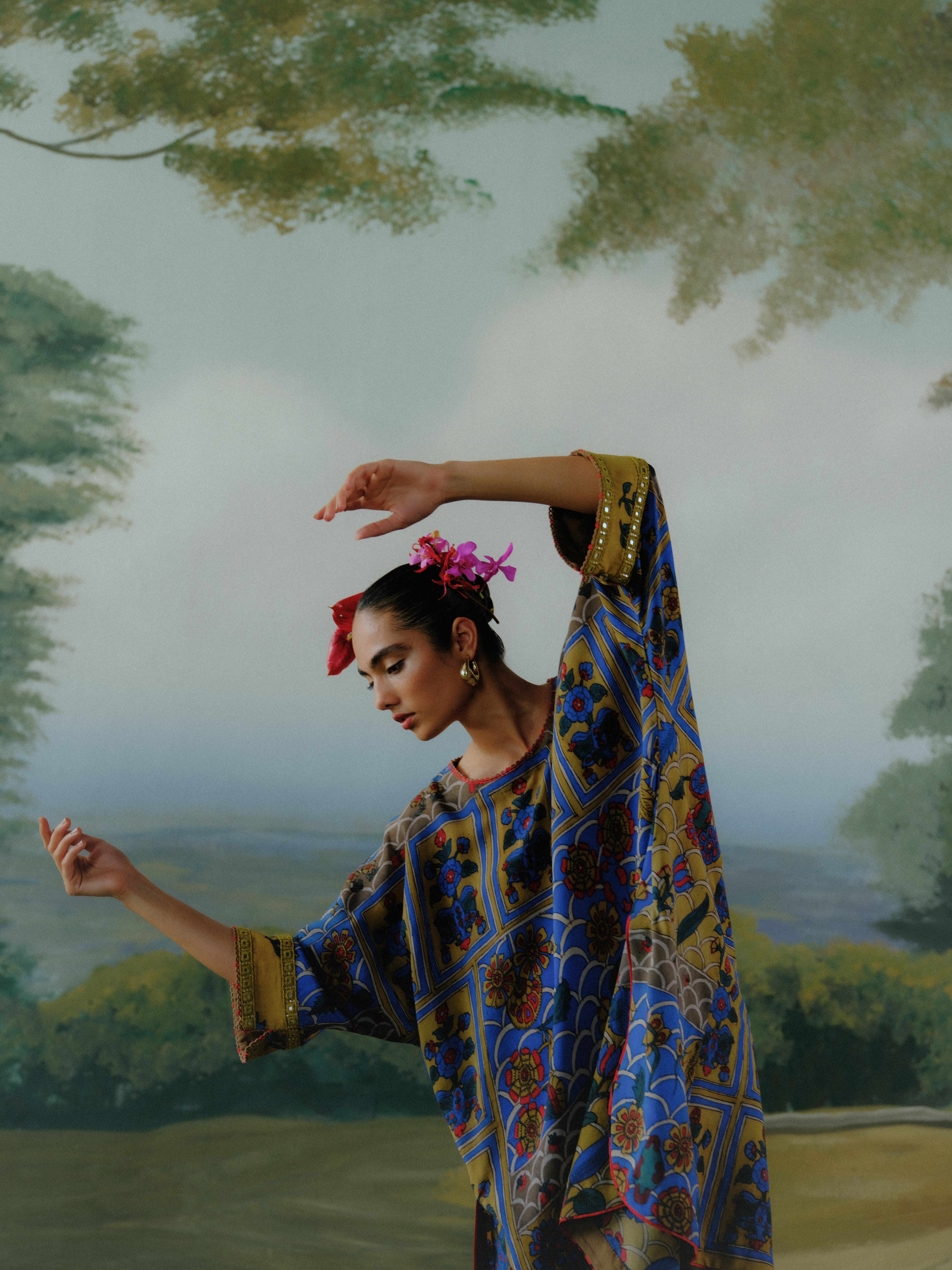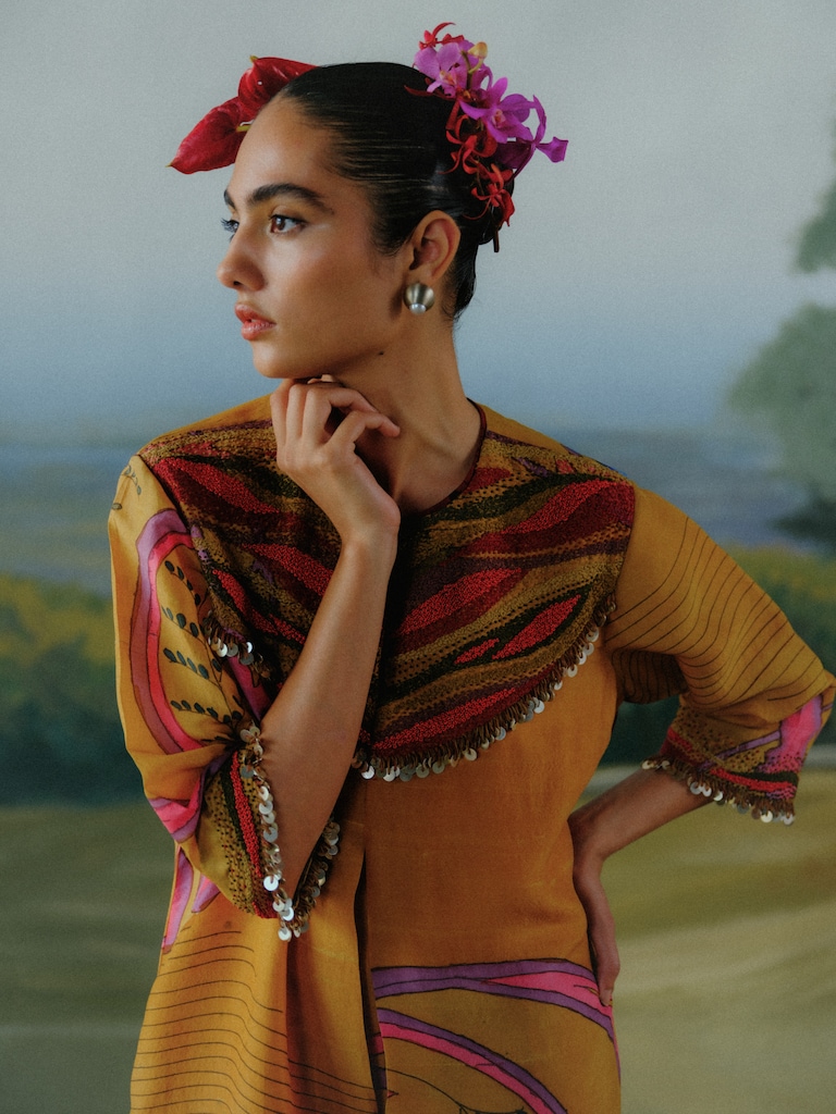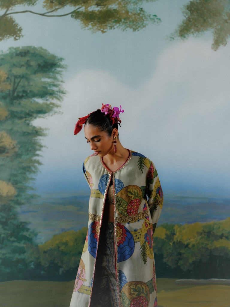 AJ: Over the last 30 years, I’ve attempted, with every collection, to make Kalamkari relevant to the contemporary moment. Indians are travelling across the world and mixing their most rooted traditions with global aspirations. A Summer Somewhere takes a page out of this cross-cultural dialogue and gives it sartorial form.