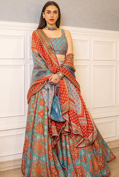 Proving yet again that one can never go wrong with a printed lehenga, Rao Hydari oozes the glamour quotient in an exquisite blue lehenga by Anita Dongre. Made from luxurious raw silk, the lehenga is embellished with unique red embroider, intricate handwork and subtle sequins inspired by Sindhi architecture. She paired it with a blue stone choker, minimal makeup, an oxidised bangle, a ring, and a coordinating potli bag, perfectly balancing lightness, practicality, and femininity. Renowned for her ability to amalgamate supreme techniques of India with contemporary elements, Anita Dongre’s designs celebrate sustainable fashion and exquisite craftsmanship.