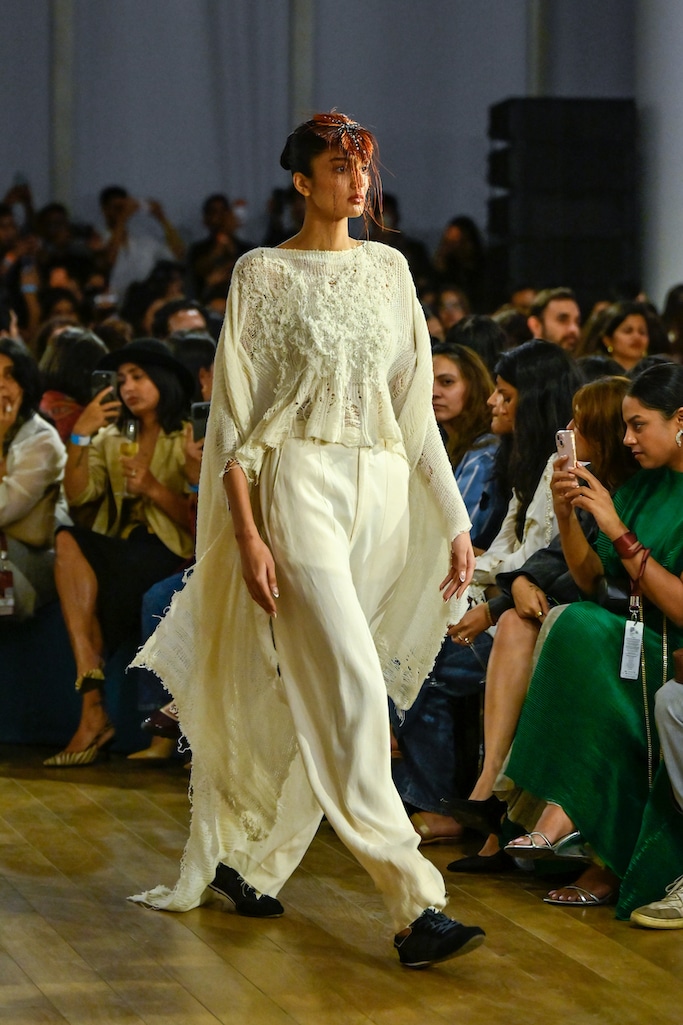 The collection focused on garments that could be styled, layered and worn in multiple ways, reflecting a relaxed yet confident design approach. The runway clothes highlighted ease in shape and the freedom of versatile separates designed for contemporary wardrobes. From draped dhoti pants and ruffled asymmetric tops to relaxed co-ord sets and floor-length gowns, the silhouettes balanced comfort with visual impact. The garments moved effortlessly between statement dressing and everyday wearability, offering pieces that felt adaptable without losing their distinctive character.