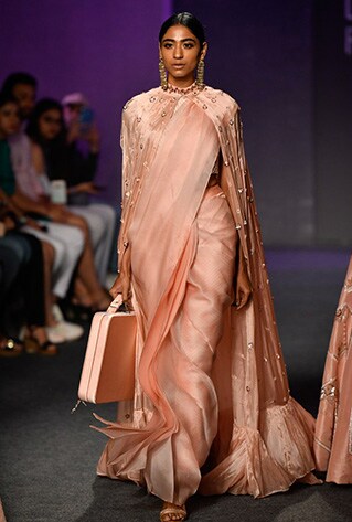 Seeking a red carpet-like charm for the upcoming soirees? Power up your saree with statement capes to sashay a cocktail affair like a star. Reserved for extravagant affairs, Masumi Mewawalla of