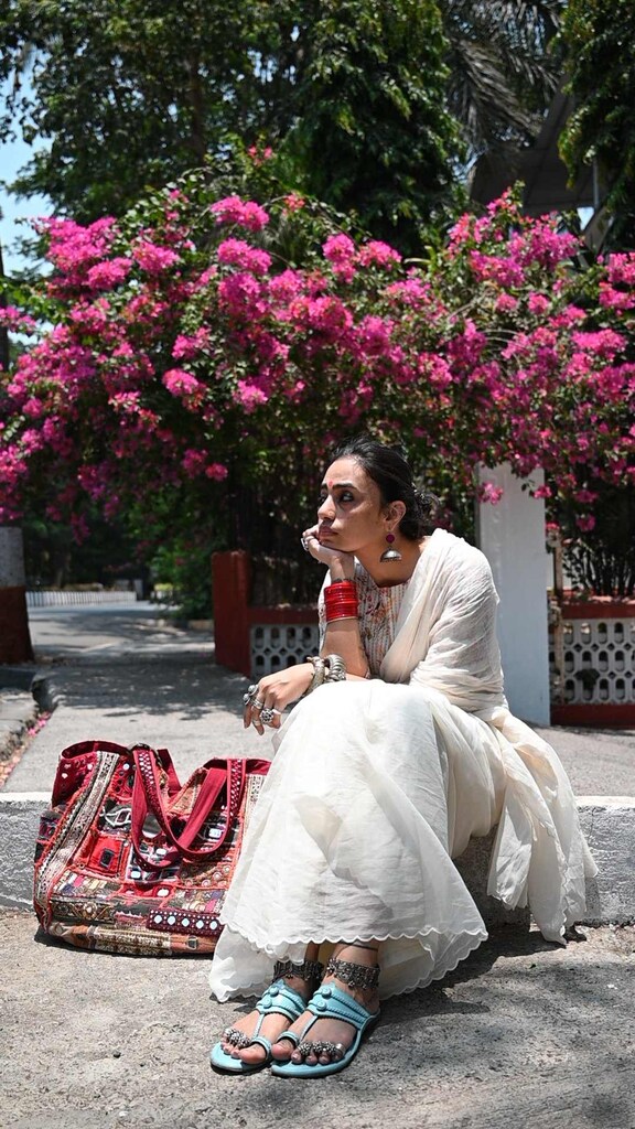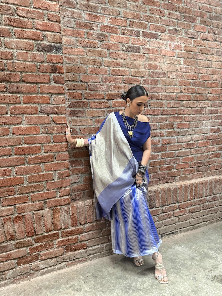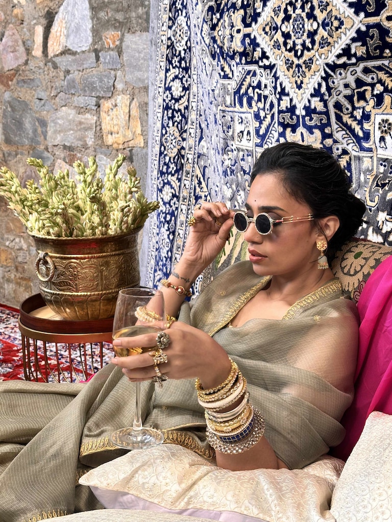 Be it block prints, gamchha checks, plain linens or just denims with a white shirt, Toor makes sure to elevate every outfit with her thick kadas, anghootis and long chains. In a world that romanticises minimalism, Toor displays a kind of brazen maximalism that’s rooted in Indian craftsmanship. “Textiles, for me, arrive before words. They feel like memories, especially those of my nani, always wrapped in the finest weaves without ever naming them. Choosing one region or weave over another feels wrong, almost unkind to me. I’m instinctively drawn towards handloom – Jamdani from Bengal, Tangaliya from Gujarat, Kunabi Weave from Goa; anything that still remembers the hands that made it. I don’t look for perfection; I look for soul. When I wear these textiles, it feels like carrying something forward.”