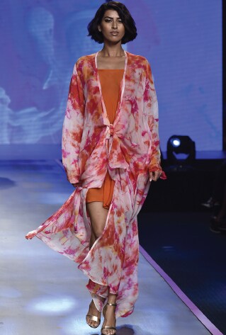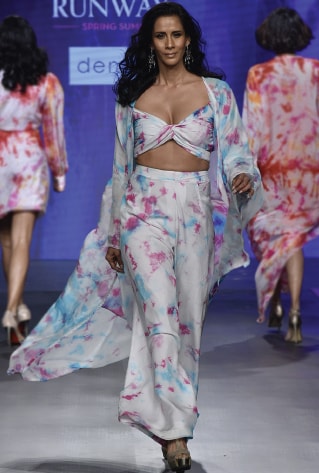 The pattern evolved with a luxurious update on the Indian ramp. Deme by Gabriella designed her breezy summer silhouettes rendering tie & dye in a melange of colours for a kaleidoscopic effect. The revival of this craft is also a result of fueling the sustainability factor here. In essence, renowned slow fashion brand Ka Sha made tie & dye cool again rendering their designs with geometric patterns. Papa Don’t Preach on the other hand showcases its couture excellence clubbing leheriya with clustered embellishments that are bound to strike you with its fancy.