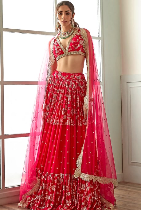 Preparing for a loved one’s wedding or getting ready to say ‘I do’ yourself? Serve an unforgettable Barbie-esque look this season. Count on Seema Gujral’s Neon Pink Embroidered Lehenga to nail the trend. The statement-making ensemble is adorned with sequins, giving the neon number a blingy update. Not in the mood for neon? Go for Studio Iris’ Rani Pink Embroidered Lehenga. Infused with flower power, the scintillating select merges the trend with cultural elements.