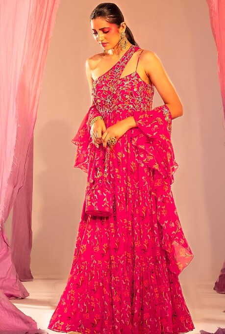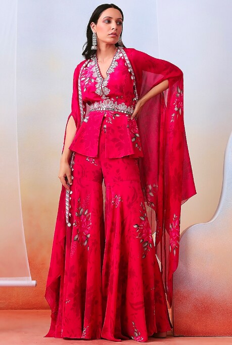 Dial up the drama with rose-tinted Cape sets! Take on the trend with the innately glamorous Hot Pink Sharara Set by Nidhika Shekhar. Detailed with awe-inspiring embellishments, this cape set proves ‘more is more.’ Give the ensemble a blooming upgrade with Isha Gupta Tayal’s Pink Printed Sharara Set. Consisting of a flowy cape, a short jacket, and a spectacularly detailed belt, this hassle-free yet sublime ensemble is just what you need to master the fashion-forward bridesmaid look.