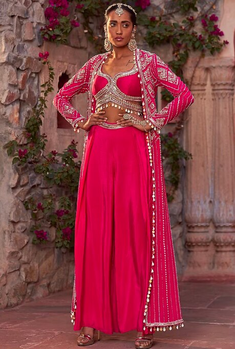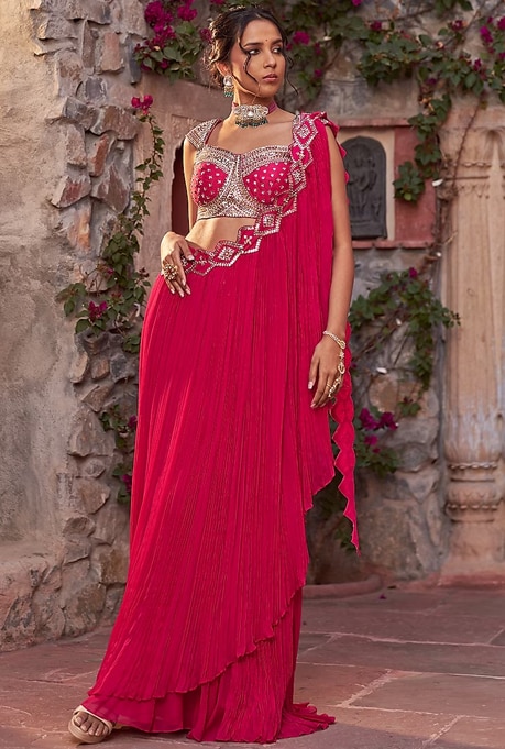 Paint your ethnic closet pink with modern interpretations of the cultural icon- the Saree. Say goodbye to the hassle of draping the silhouette with the Fuchsia Pink Pre-Draped Saree by Nidhika Shekhar. Teamed with a heavily-detailed blouse, the eye-catching ensemble is crafted in crinkle fabric and adorned with hand embroidery. If you’re looking to take your fashion game up a notch, opt for Hot Pink Skirt Saree by Rishi & Vibhuti! Paired with an embellished belt, this trendsetting Saree will surely leave the crowd awe-struck.