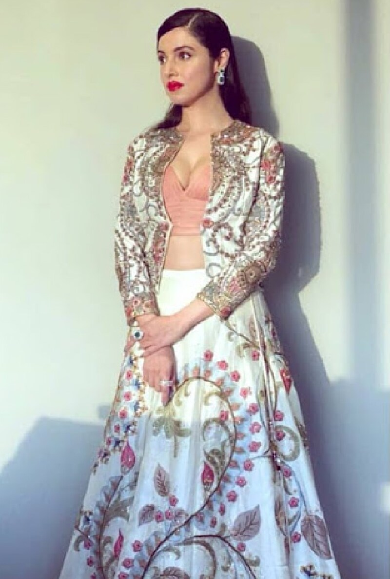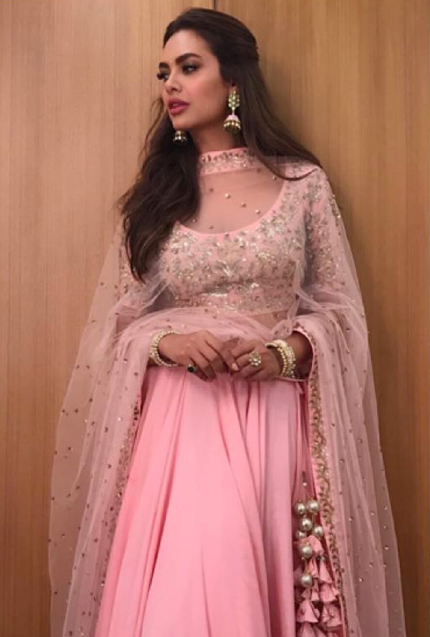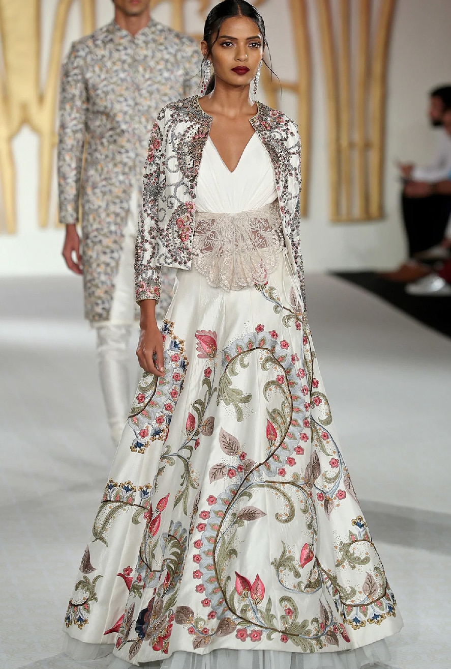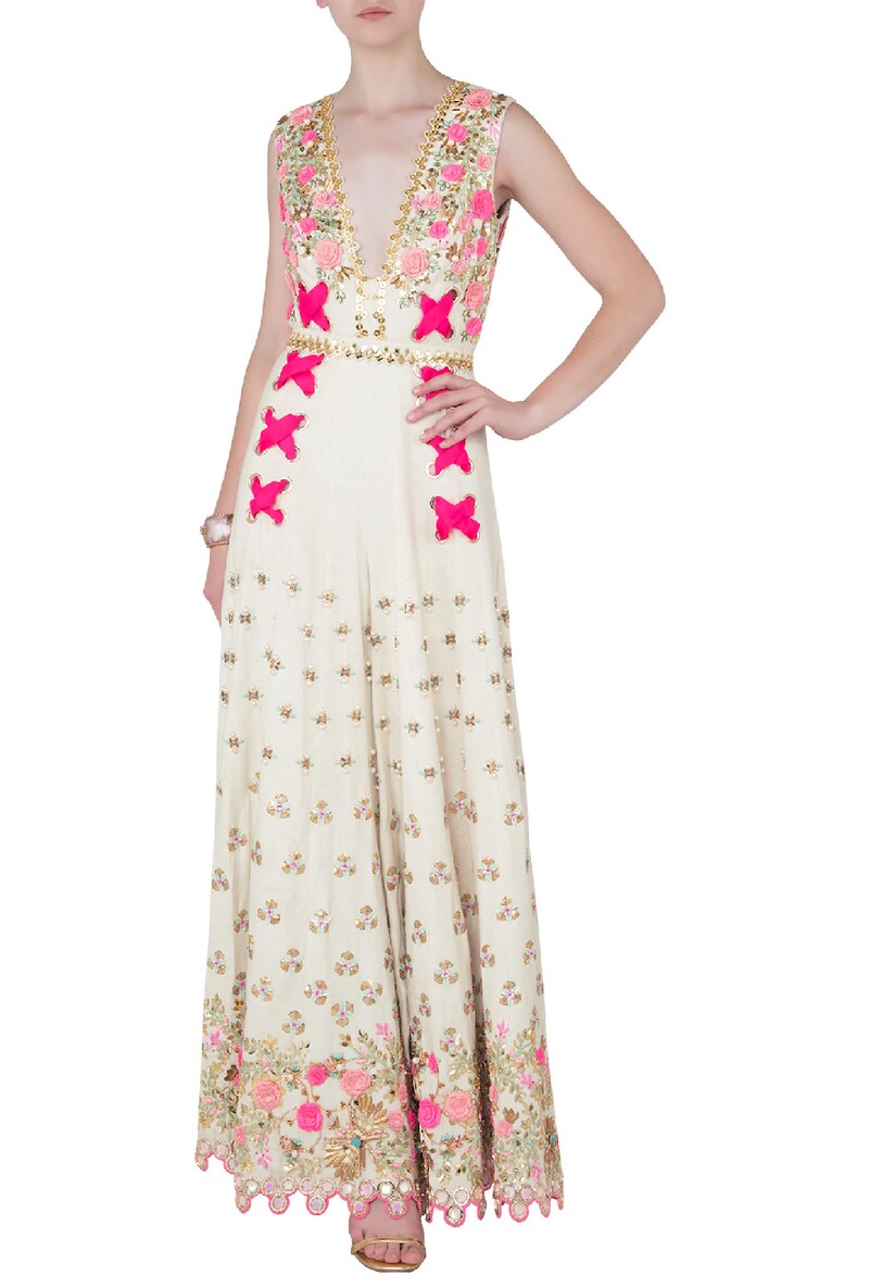 Instilling contemporary grace, Divya Khosla’s richly punctuated look in this Varun Bahl will beautifully match the bride’s glory if you’re playing the bridesmaid. Crafted with hand embroidery and frill details in a rich ivory tone, the billowy ensemble makes for a perfect reception soiree ensemble. Expert tip: Drop off the jacket for after-party revelries.