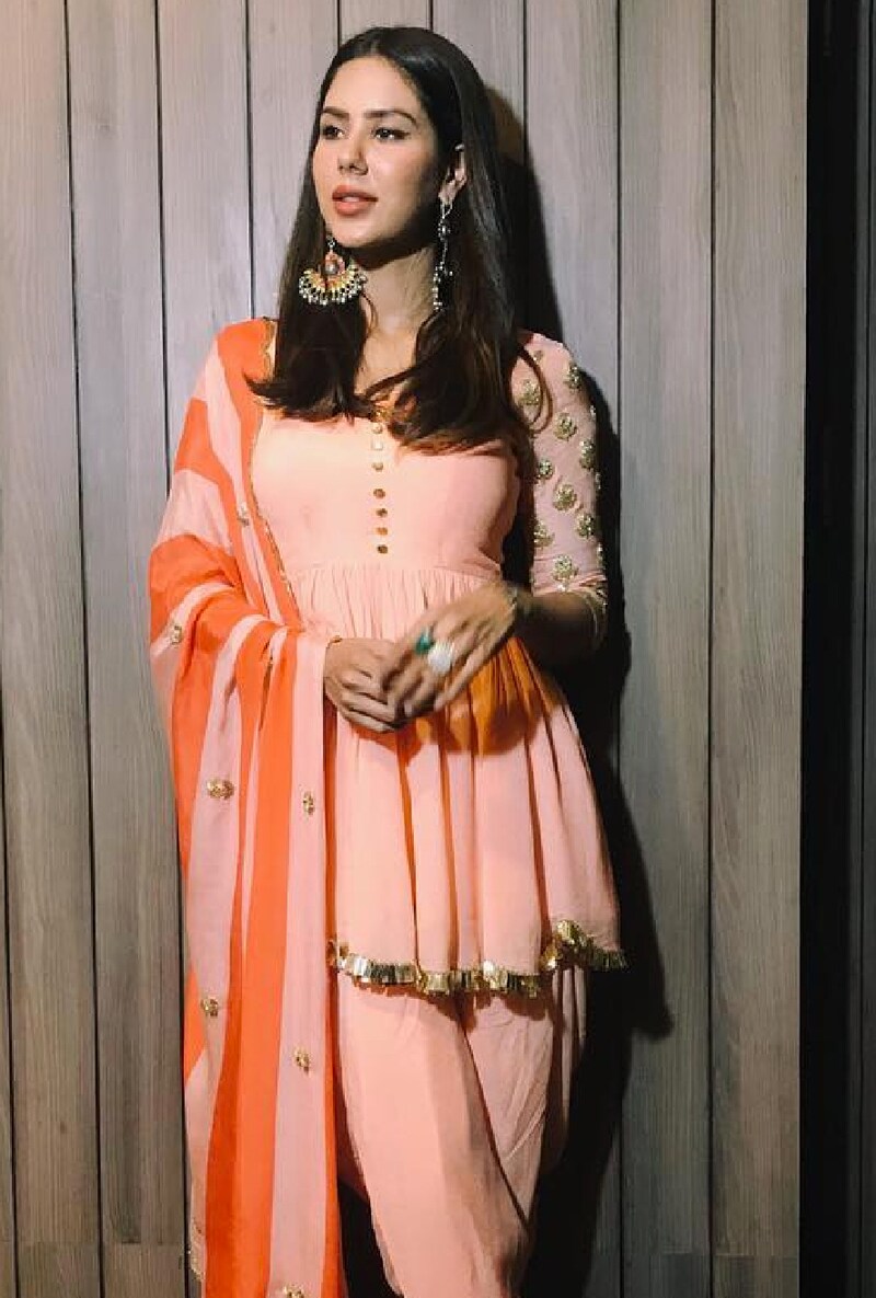 Slaying it with bounteous chicness, Sonam Bajwa channels ethnicity with an effortless stance. The dhoti draped bottom and peplum gets the perfect elevation with striped dupatta in this outfit by Ease. Pick the look for Mehendi fun & frolics to make heads turn.