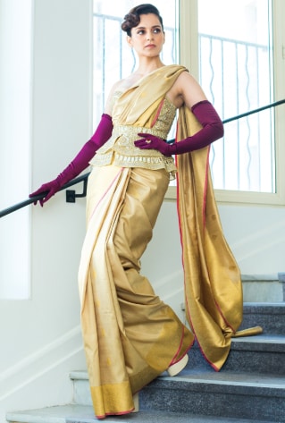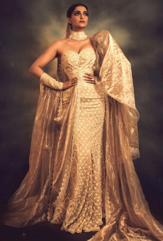 Sonam Kapoor has mastered her red carpet sashay game by now and while we await her red carpet appearances she has already taken the internet by storm with her first look. Indian connoisseurs Abu Jani & Sandeep Khosla customized an ivory and gold corset saree gown. Celebrating the modernity of today’s age Maharani, the ensemble was painstakingly embellished with details and drapes and paired with a handcrafted choker by the designer duo.
