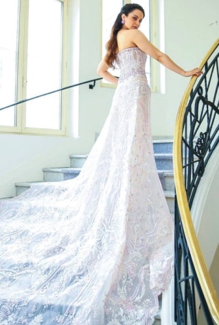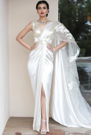 Diana Penty made a scintillating debut appearance at the Cannes Film Festival this year. Channelling her innate ethereal vibes, the leggy las dressed like a vision in a metallic ivory saree gown by Amit Aggarwal. She accentuated her cocktail look with elegant pearls by Aquamarine Jewellery. Her red carpet introduction was a scene-stealing affair as she walked down donning a feathery voluminous gown by Nedo by Nedret Taciroglu. Her bold red lips and jewels by De Grisogono punctuated the look just perfectly.