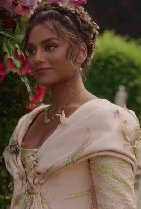John Glaser, Bridgerton’s lead costume designer, said while commenting on a change in her style in season 3, “We veered away from unnatural colours for her and used all natural colours, like skin tone colour and colours of water. We wanted her to look warm, and like she’s coming back from a warm climate. We also wanted to show that she had nothing to hide. She’s coming back from home, she’s married, she’s a strong woman, and she’s not going to hide her heritage.”