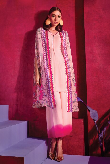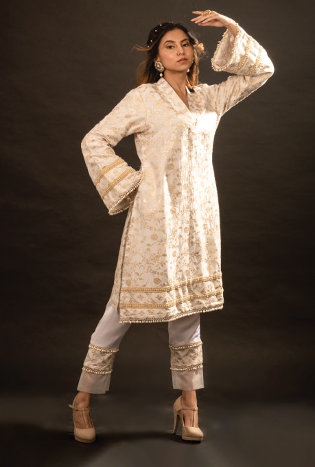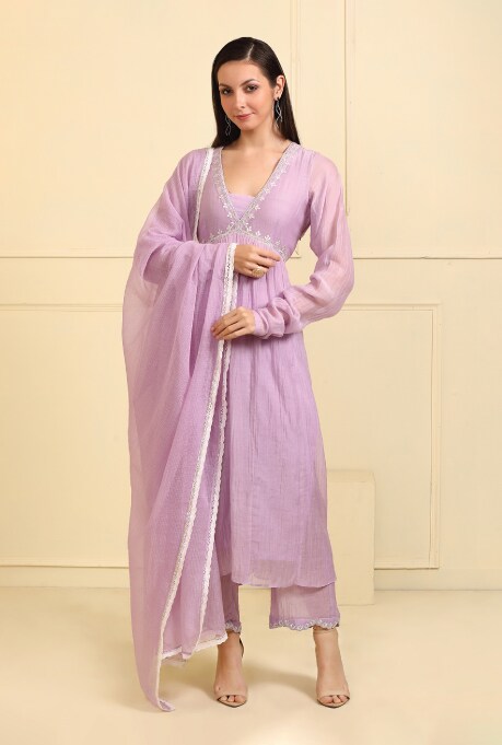 Anarkali kurtas hold a significant place in India’s rich ethnic heritage, boasting a storied history. The hallmark of this graceful ensemble lies in the flair A-line pleated skirt, available in lengths that range from knees to floor. They are adorned with intricate embroidery, sequins and other ornamental embellishments that add a touch of opulence. Typically, they are paired with narrow leggings which creates a striking contrast to the voluminous silhouette. The Pink & Grey Digital Printed Kurta Set by Siddhartha Bansal is a stunning example which epitomises classic splendour. For those who prefer an alternative to leggings, opt for straight pants like the one in Neha Khullar’s Lilac Chanderi Silk & Mulmul Embroidered Kurta Set, which adds a subtle charm to the outfit.