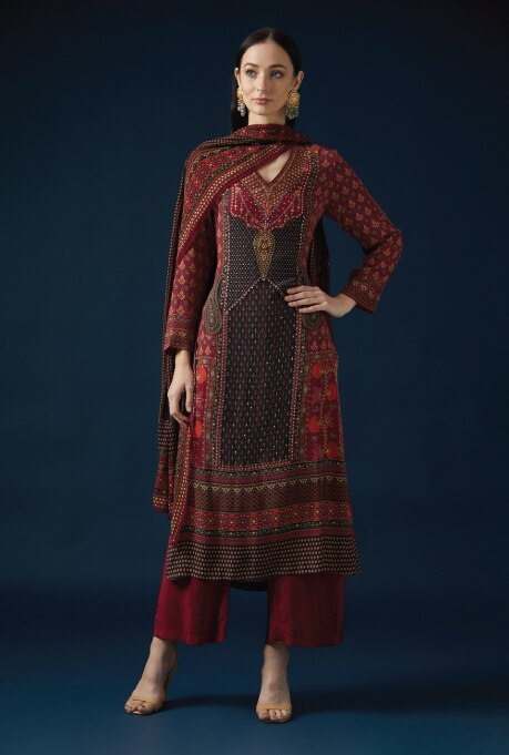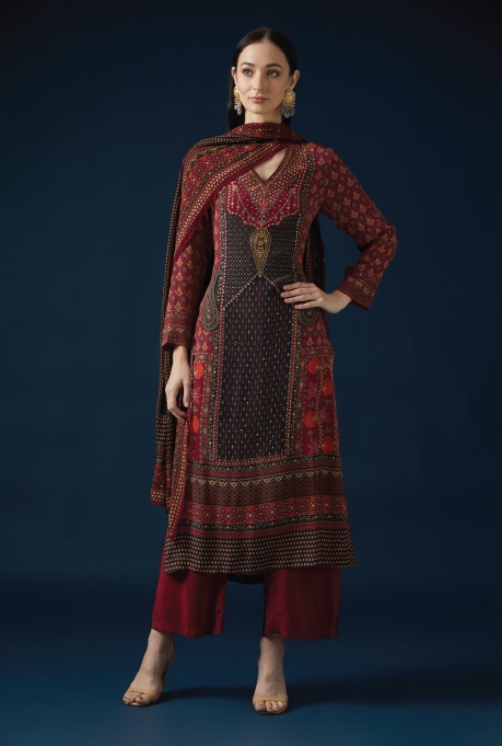 Straight Kurtas exhibits the elegance of traditional craftsmanship with their simple yet delicate design. It is characterised by a simple straight cut that gracefully falls in a vertical line. The gorgeous pieces combine minimalism with a regal charm, making them perfect for celebrations. Pairing the kurta with straight pants like the resplendent Monk & Mei’s Gold Brocade Silk Floral Kurta Set infuses a delightful blend of illuminating opulence and traditional flair. The Red Bemberg Crepe Embroidered & Printed Kurta Set by Nirraamyaa is a splendid alternative for those seeking regal allure. The ensemble harmoniously fuses deep colours and intricate embroidery, elevating the overall look.