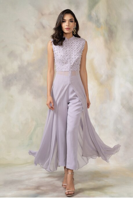 Indo-Western Kurtas are an ideal choice for new-age divas looking to make a statement on this particular day. These silhouettes merged traditional elements with asymmetrical designs, unique necklines and attractive sleeve styles. On a hunt for refined styles adorned with dazzling embroidery? The Lilac Embroidered Kurta Set by Pooja Peshoria is a suitable choice. The silhouette exemplifies graceful allure, capturing all eyes with its delicate craftsmanship. For those who desire an amalgamation of contemporary silhouettes with time-honoured panache, the Blush Pink Printed & Embroidered Kurta Set from Limerick by Abirr N’ Nanki deserves your attention. This Indo-Western kurta embodies the spirit of elite fashion, allowing you to embrace the best of both worlds.