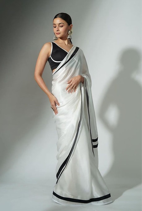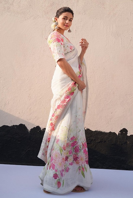 One of Alia Bhatt’s career’s most talked about films, Gangubai Kathiawadi, caught the eyes of many adherent fans thanks to her remarkable performance and the elegant white sarees she adorned. For the press tour, the actress wore an elegant lineup of white sarees that resembled the character’s choice of clothing in the movie. Not only did she exclusively wear the pristine shade during the promotions, but she also adopted the signature Namaste pose, mirroring the way her character greets everyone in the film.