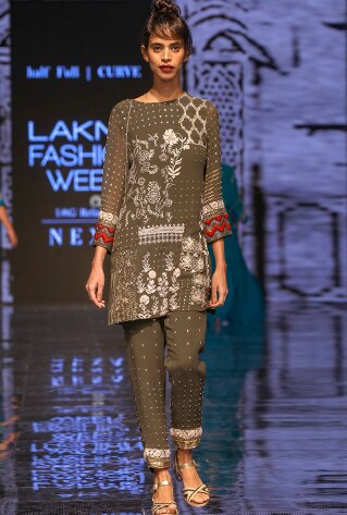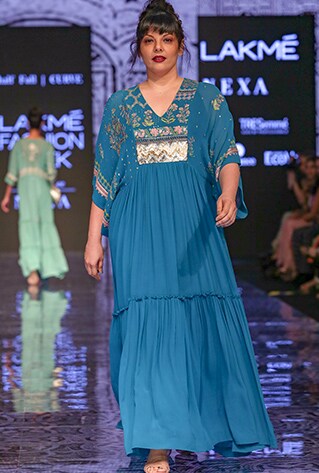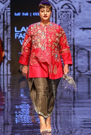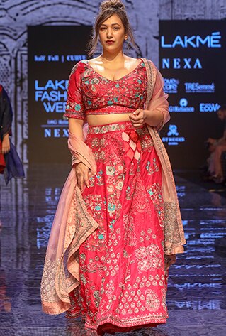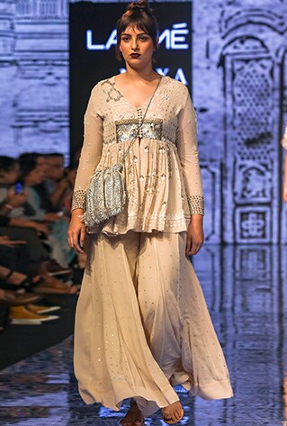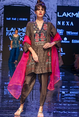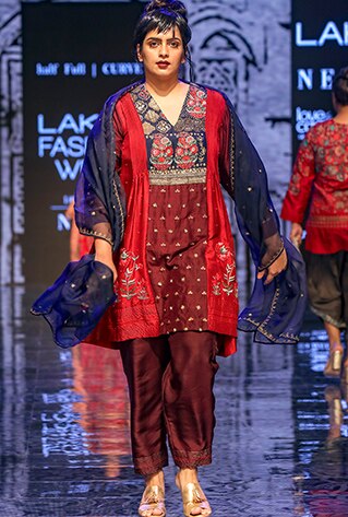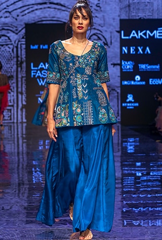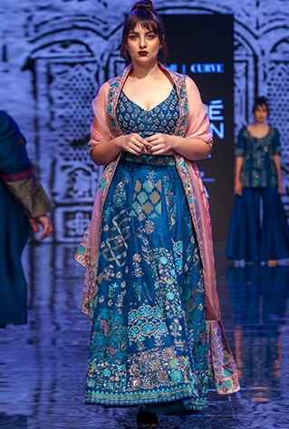 Half Full Curve showcased their latest collection titled ‘Gulab Bagh’ at Lakme Fashion Week Winter/Festive ’19 that was widely appreciated and praised. The collection took inspiration from oriental culture and interiors of royal palaces. Merging urban styles with oriental textures and intricate patterns, the label featured unique fusion and traditional Indian ensembles. The colour scheme includes shades of navy blue, ecru, maroon and pink, that go with the festive and wedding season perfectly. Portraying an old-world charm with a mélange of traditional elements, fluid silhouettes and unconventional designs, they created a world of glitz and glamour.
