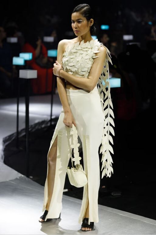 Rimzim Dadu is known for pushing boundaries with innovative textiles forming the signature of its cutting-edge collections. Championing veganism, the label implies a mindful and artisanal way of rendering 3D art on unconventional silhouettes. The designer uses cord and raffia techniques to create a vegan alternative to leather.