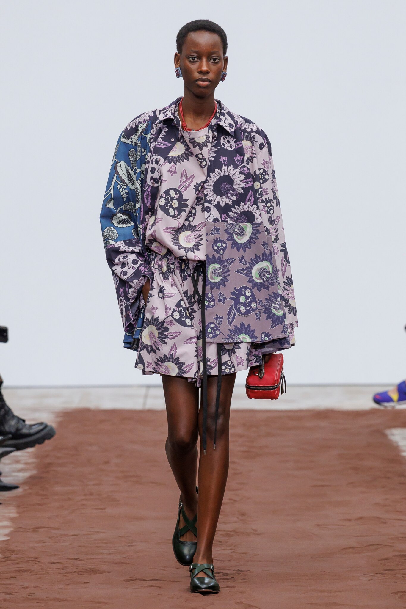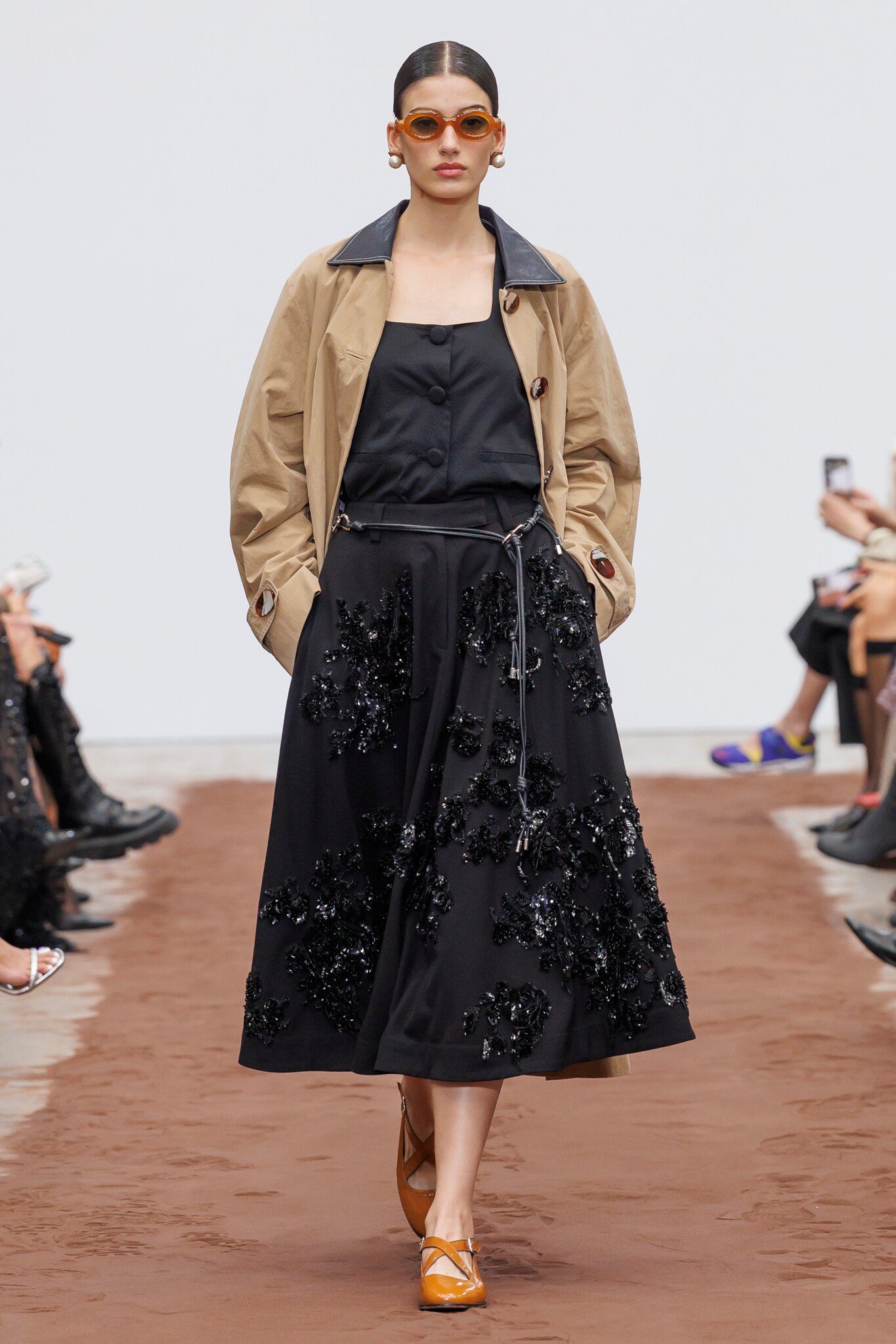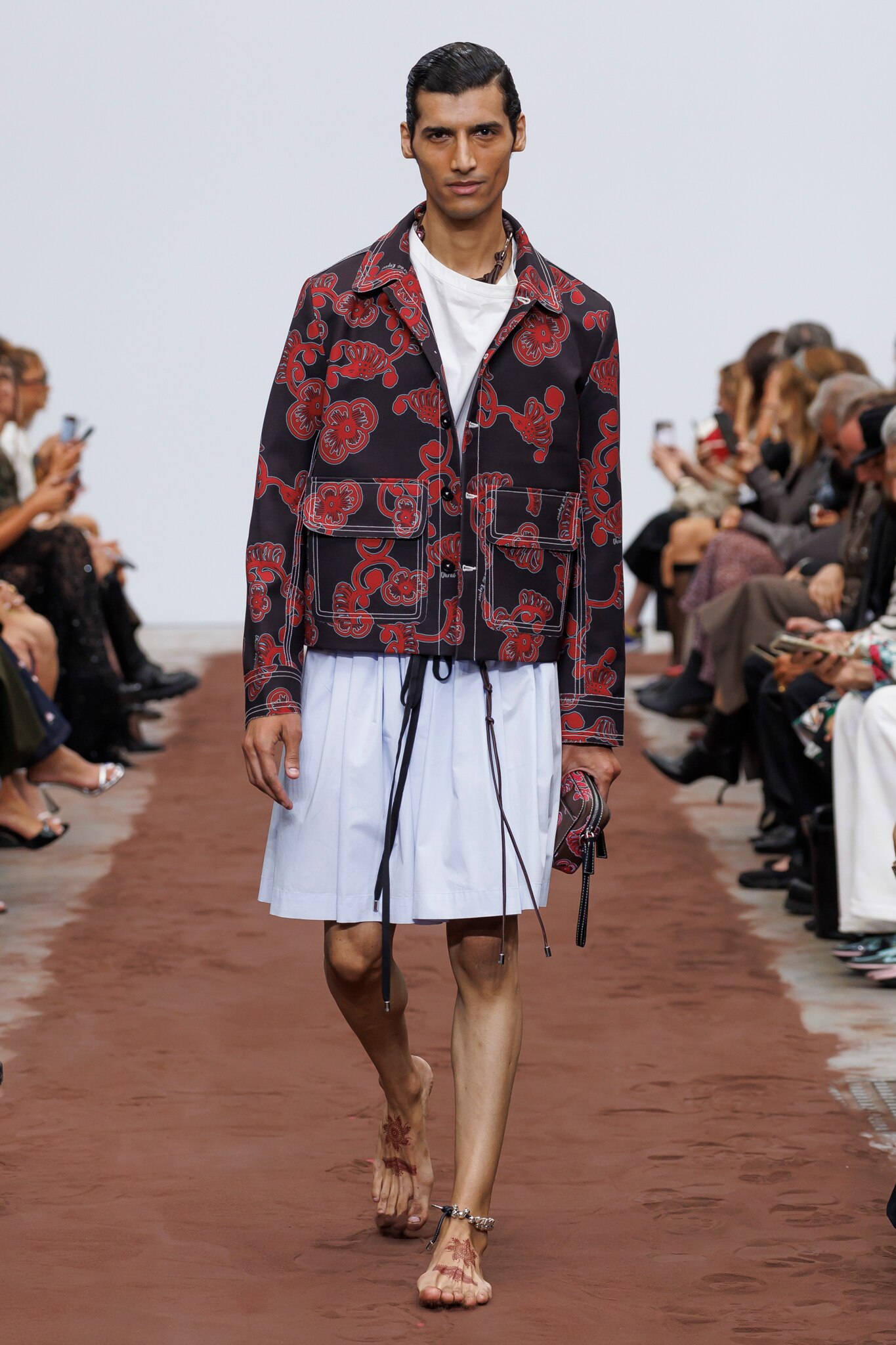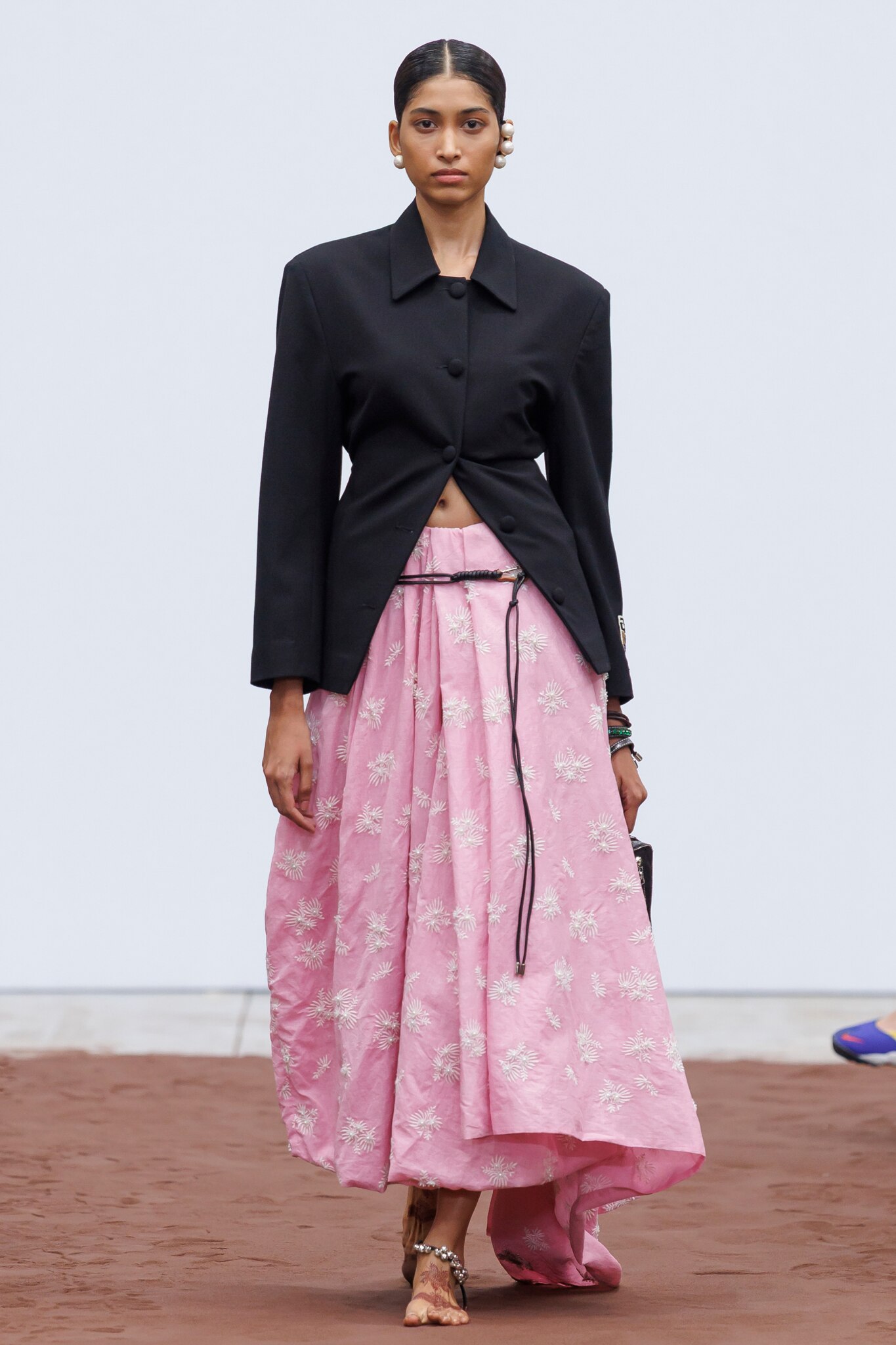 The creative maven’s distinctive flair for embroidery was evident across most silhouettes, including tank top-style minidresses covered in beadwork and petticoats reconstructed as pleated skirts featuring floral motifs. While his love for streetwear took a backseat this season, it remained alive through striking juxtapositions of prints – floral embroidery over checks, block print-style patterns on denim, and Jaipur pottery motifs.