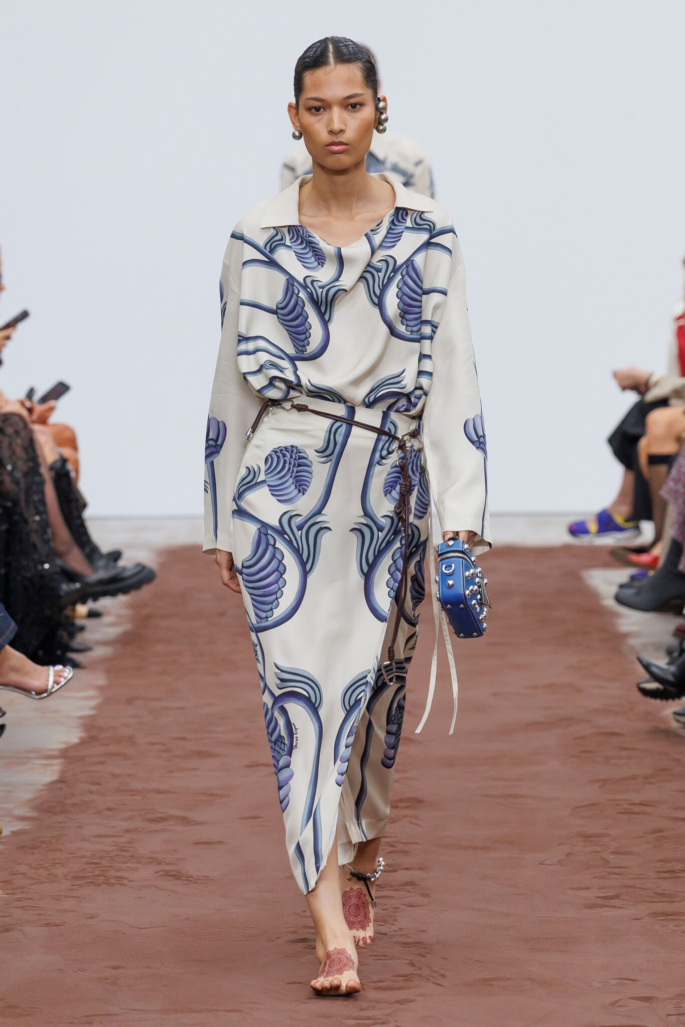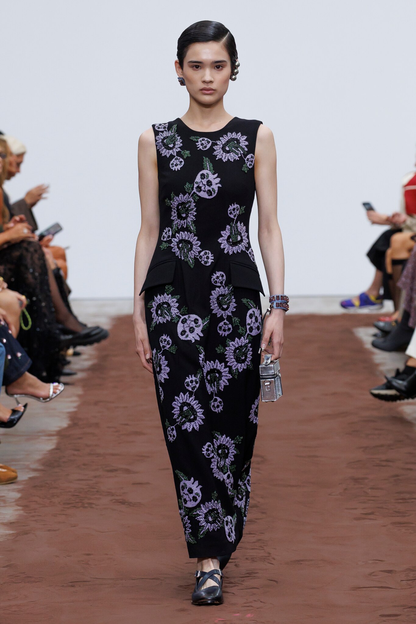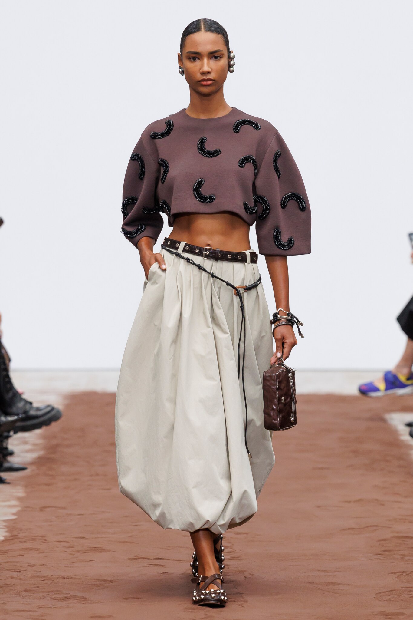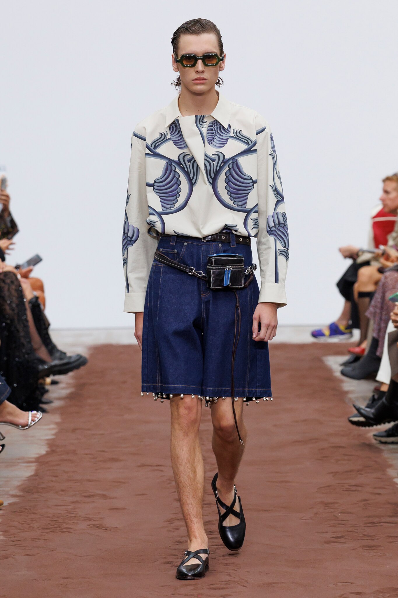 The creative maven’s distinctive flair for embroidery was evident across most silhouettes, including tank top-style minidresses covered in beadwork and petticoats reconstructed as pleated skirts featuring floral motifs. While his love for streetwear took a backseat this season, it remained alive through striking juxtapositions of prints – floral embroidery over checks, block print-style patterns on denim, and Jaipur pottery motifs.