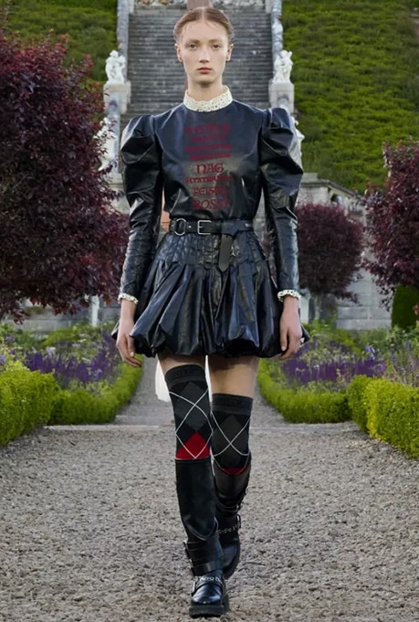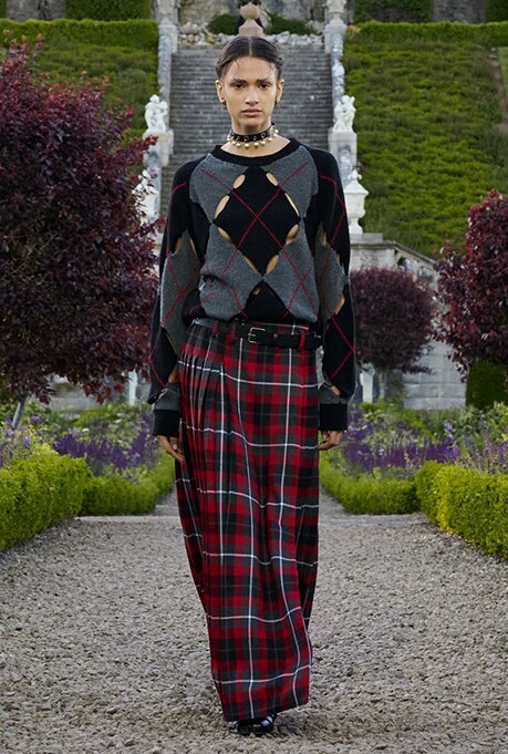 This show marked both Dior’s return and the fashion house’s deep ties with Scotland. It all began when the founder, Monsieur Dior, presented his creation in Perthshire, in the ballroom of the Gleneagles Hotel, which changed how the country perceived textile traditions. The Cruise 2025 lineup is an ode to all that but with Chiuri’s very own twist. Strutting down against a verdant backdrop of manicured gardens, the army of models donned looks that were a juxtaposition of Scotland’s heritage and new-age punk. Plaid Kilts dominated the stone pathways, along with leather gloves, biker boots, statement belts and high-octane jewellery.