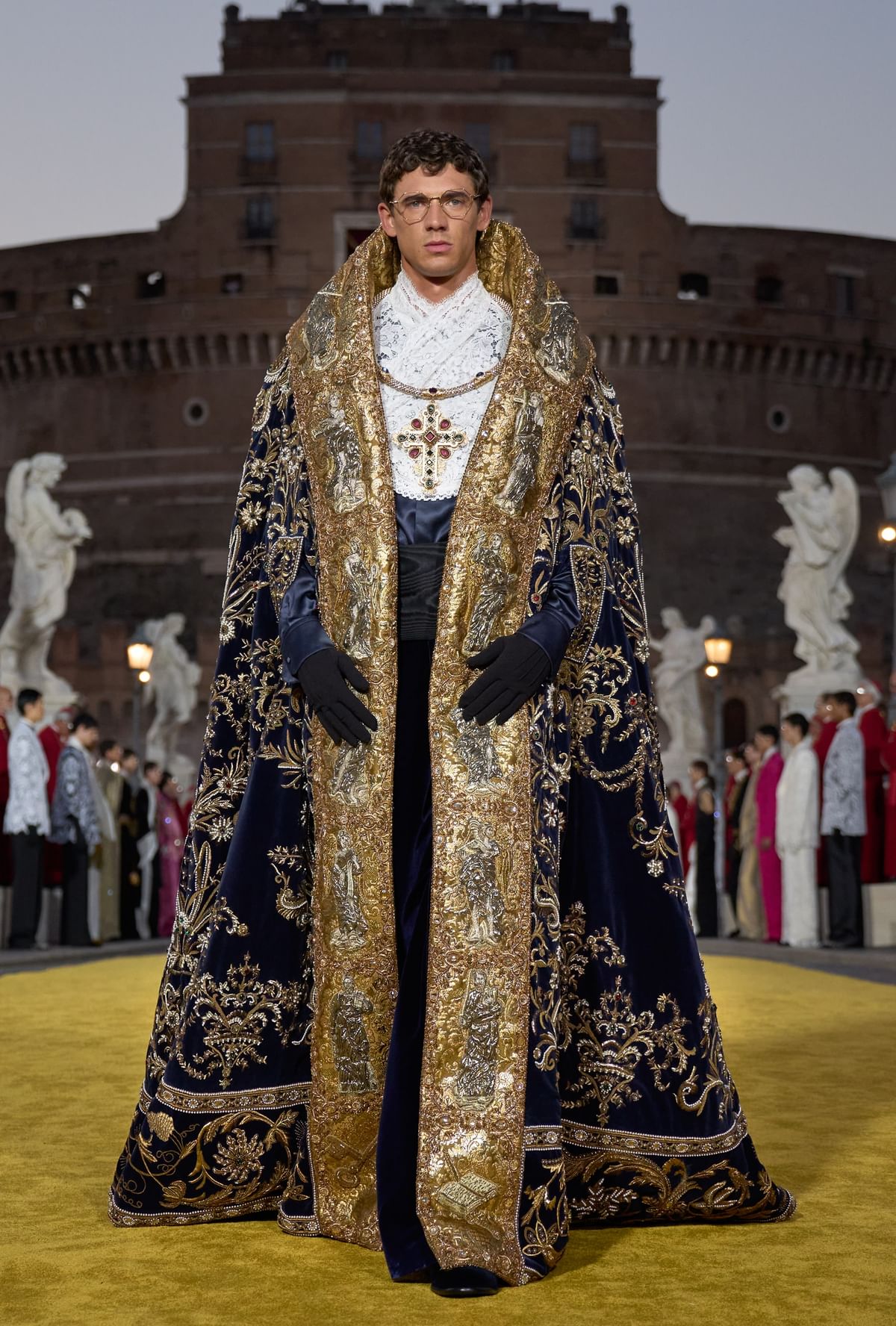 The visual language of devotion was expressed through pieces like double-breasted suits featuring bejewelled crosses, sheer white tunics embroidered with ecclesiastical motifs, and luxurious floor-length capes eminiscent of papal regalia.