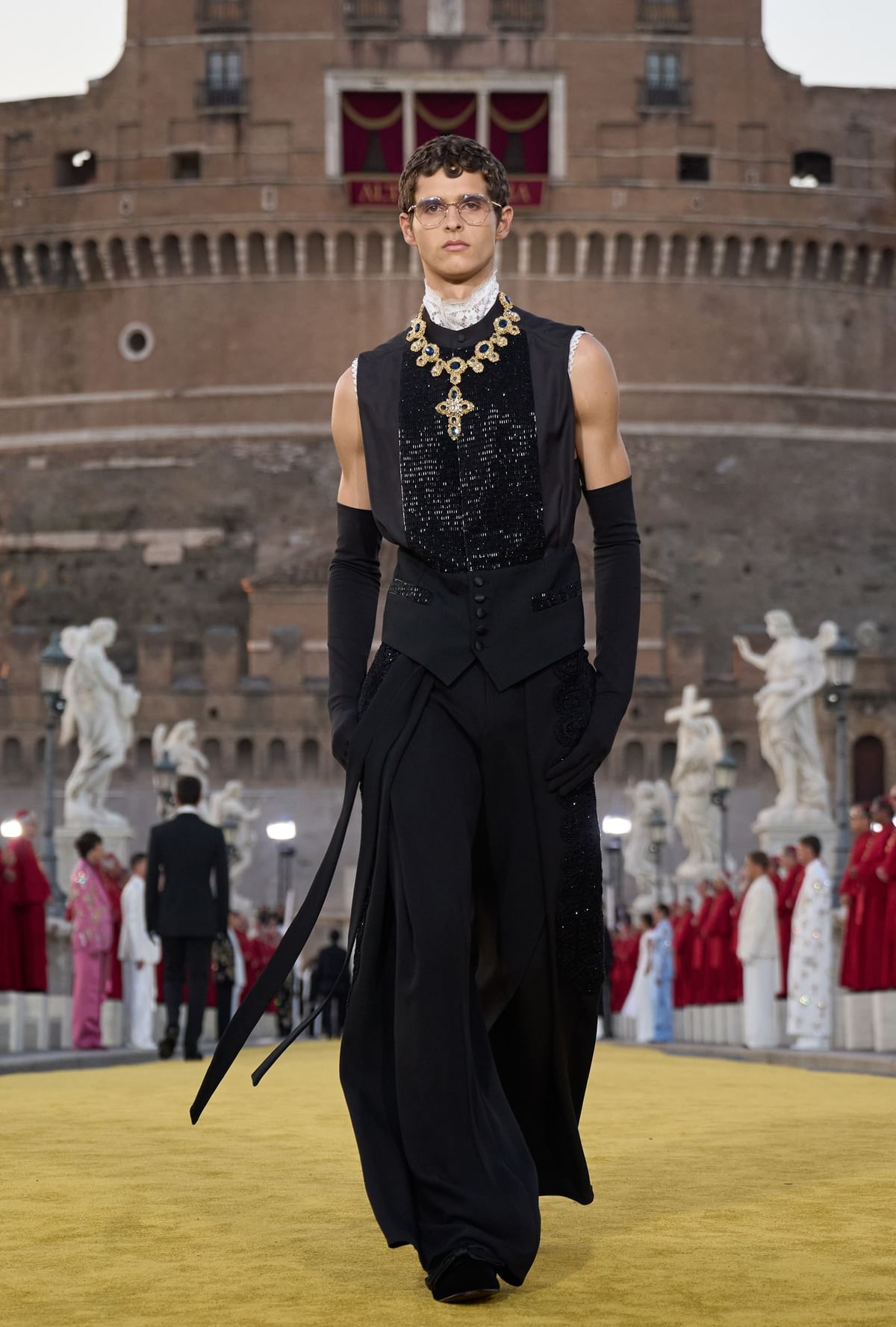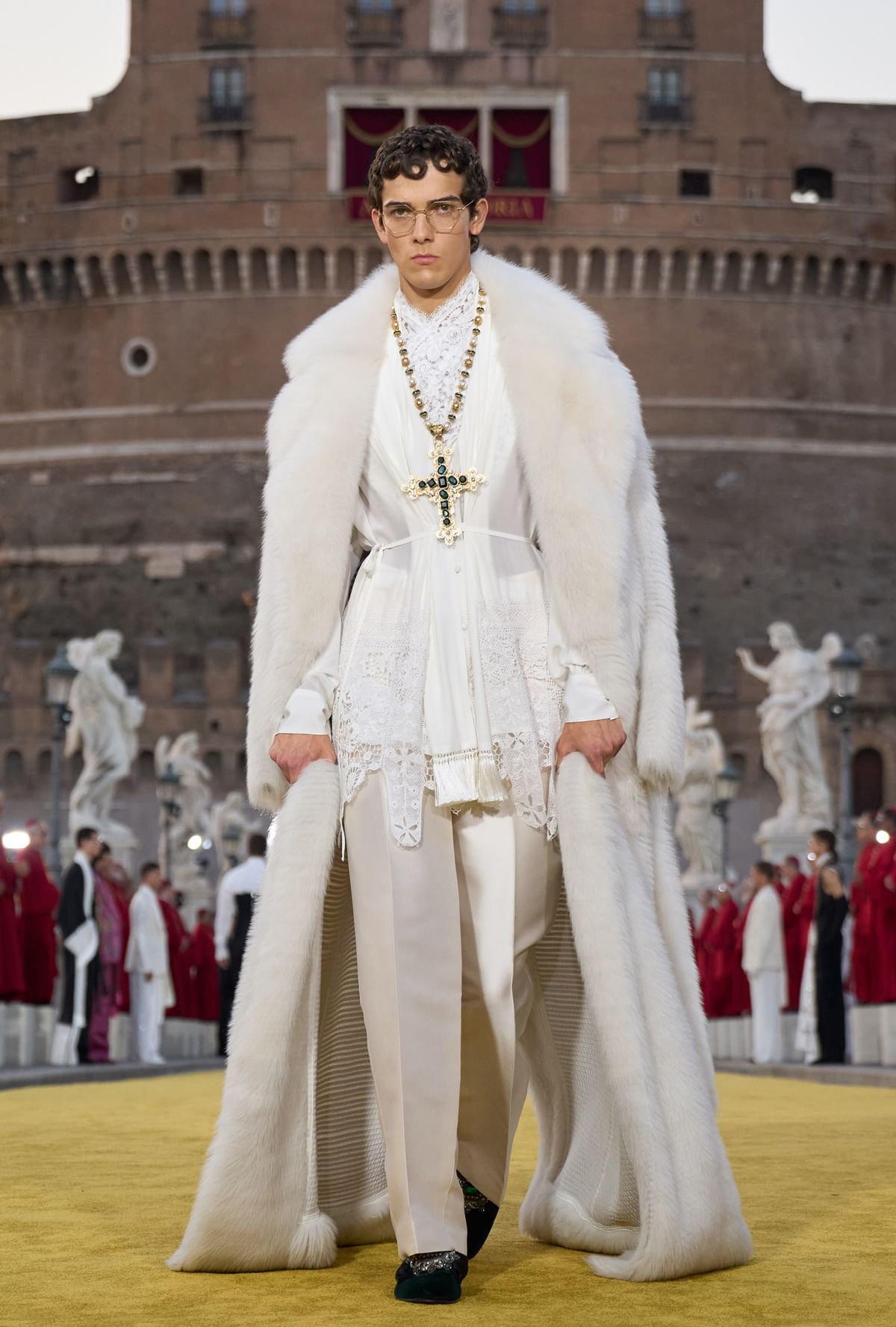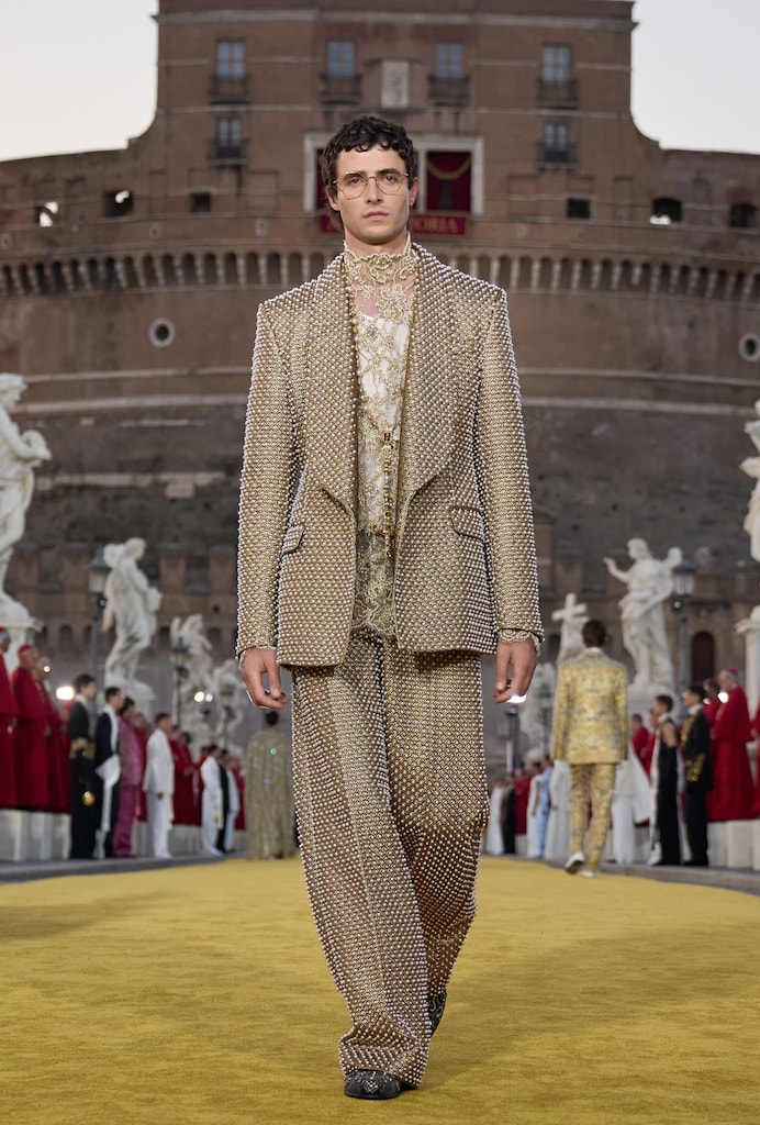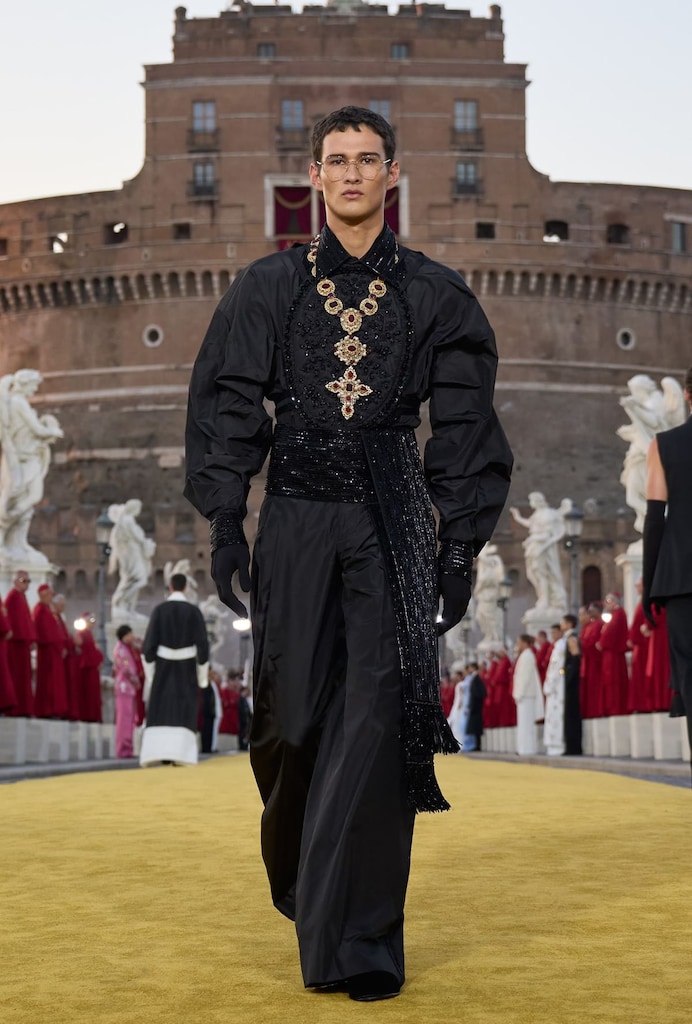 With classical music setting the tone, 40 Vatican bishops walked onto the bridge that connects the city of Rome and the Ponte Sant’Angelo, turning it into Dolce & Gabbana’s grand runway. The luxury brand called the fashion show, part of three days of showcases in the Eternal City, “an homage to clerical tailoring”, presenting creations inspired by ecclesiastical attire.