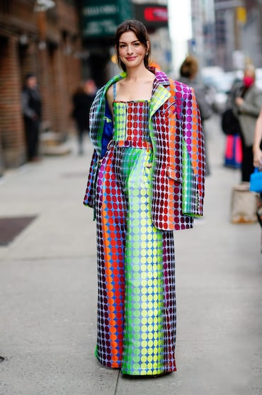 Hathaway took the stage of The Late Show With Stephen Colbert in a kaleidoscopic polka-dotted Christopher John Rogers ensemble. The striking combination consisting of a blazer, corset top, and a pair of palazzo trousers is the perfect take on maximalism.