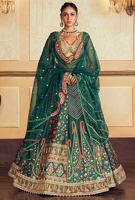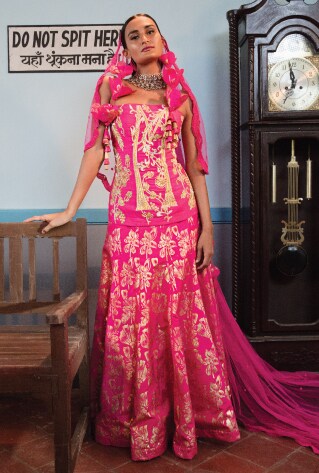Borrowed from the Victorian Era, corset blouses are just perfect for finding a leeway from the same old silhouettes or overdone styles. If you have a well-toned hourglass figure, don’t shy away from flaunting your curves by choosing a corset-paired lehenga. Pull off this effortlessly ultra-feminine statement piece and raise the bar with your upbeat mojo at the next wedding soiree.