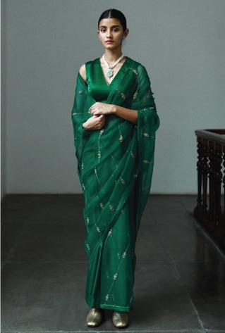 We’re tagging this Raw Mango saree as a bridal trousseau essential. The deep green hue, wispy silk fabric and dainty embellishments make it an archival piece.