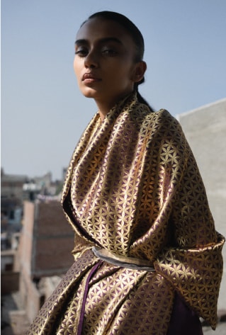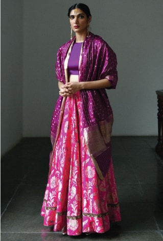 Our favourite from the Raw Mango Heer collection, the striking combination of pink with purple and opulence of golden touches make it perfect for nuptials. Its weightless finery can dazzle afresh for decades to come.
