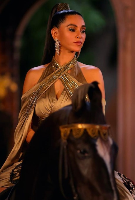 Exuding understated elegance, the actor wore a sublime powder pink Saree from Torani that brilliantly captured the sombre mood of the scene. To punctuate her fashion-filled journey this season, Dulipala wore Amit Aggarwal’s minimalist metallic saree featuring a signature structured drape in the closing shot.