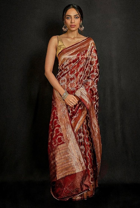 In season two’s announcement poster, Dhulipala was seen in a champagne gold gown with a structured hooded drape from Tarun Tahiliani. Another stunning creation from the eponymous label, a delicate blush pink Banarasi tissue saree, was worn by the actor in one of the wedding scenes.