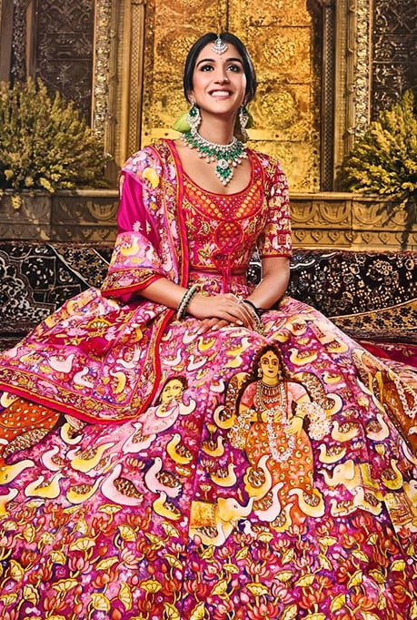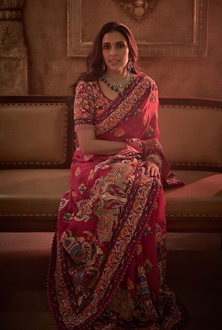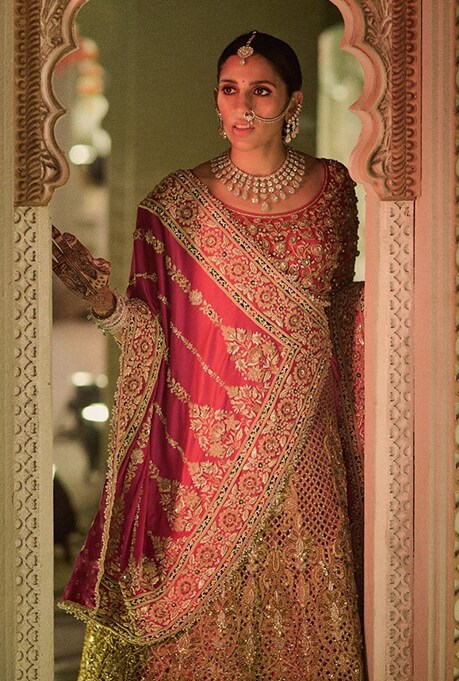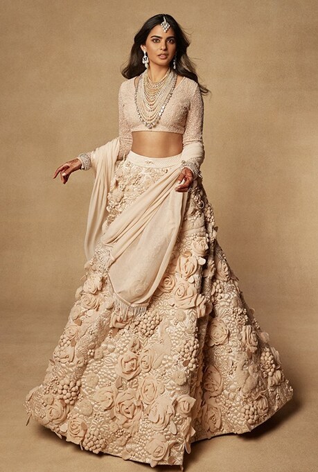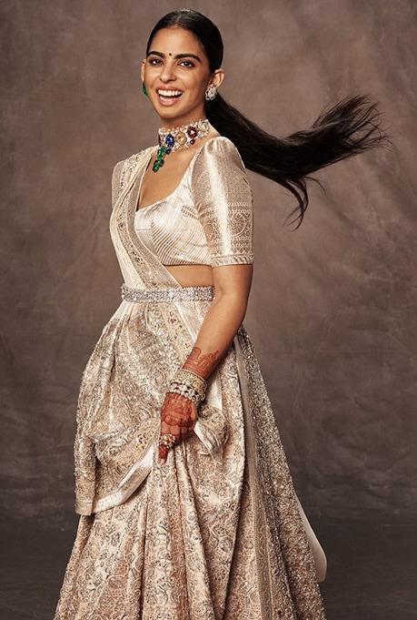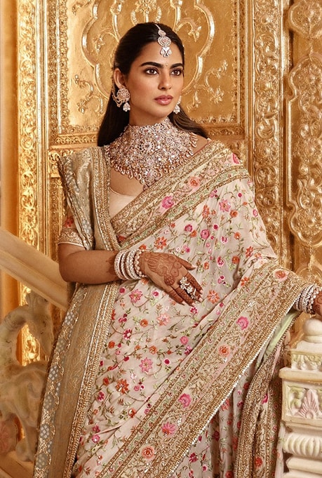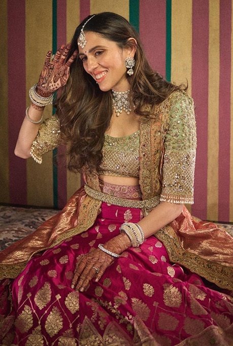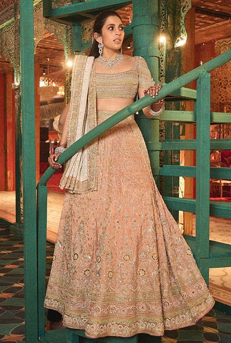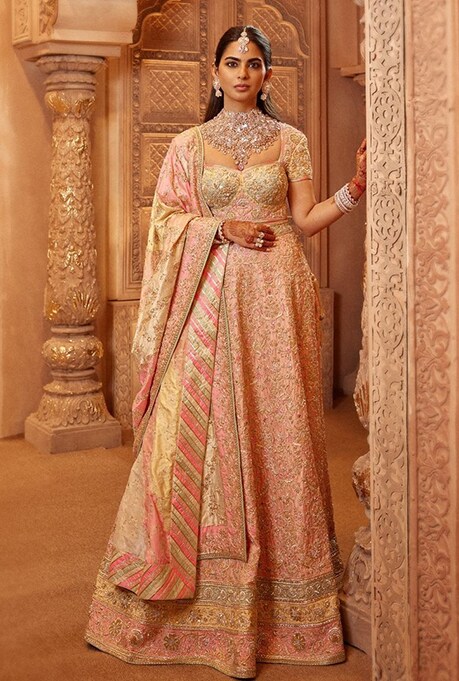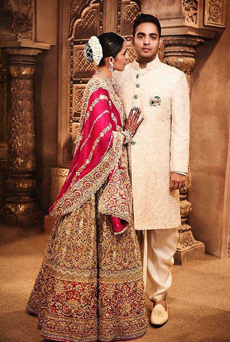 Shloka Mehta Ambani graced most of the festivities with creations made by Abu Jani Sandeep Khosla. But for the Shubh Ashirwad ceremony, she handpicked an archival Manish Malhotra ensemble, highlighting India’s rich textile heritage.