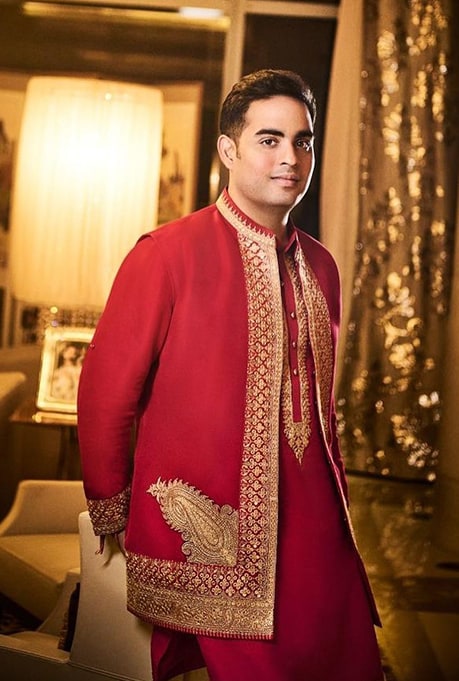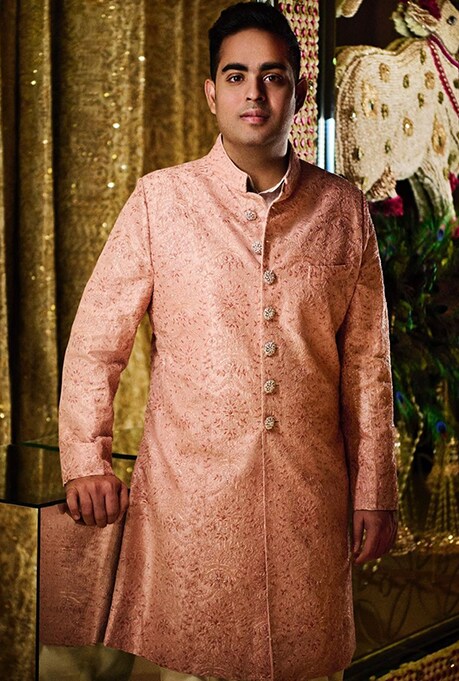 The groom’s elder brother exuded class and sophistication at the baraat and the wedding, donning majestic sherwanis by Raghavendra Rathore. Akash Ambani was seen in a printed bandhgala sherwani and dhoti by Anamika Khanna for the Shubh Ashirwad ceremony and a charming coral-red bundi set from Shantanu Goenka for the reception.