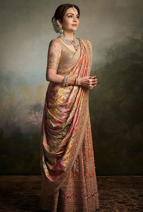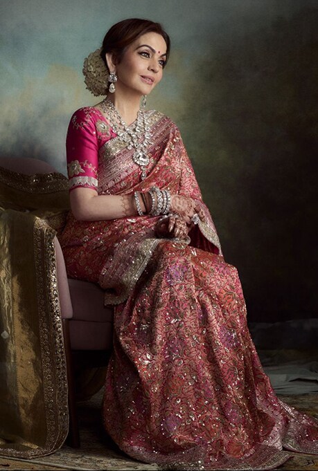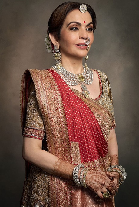The groom’s mother, Nita Ambani, showcased her fashion prowess and her love for time-honoured craftsmanship during the wedding. She adorned herself in stunning creations by Abu Jani Sandeep Khosla for the baraat, wedding, and Shubh Ashirwad ceremony. For the couple’s reception, she radiated elegance in a regal saree designed by none other than Manish Malhotra.