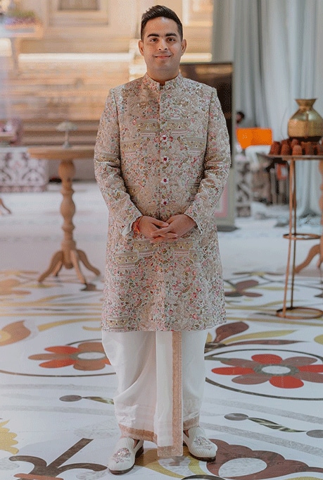 The father of the groom, Mr. Mukesh Ambani, wore an understated yet charming blush pink sherwani by Raghavendra Rathore. Throughout the wedding festivities, he consistently opted for subtle pastel shades, embodying an effortless charm and refinement.