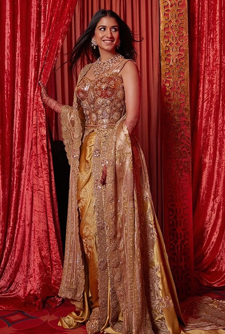 The gleaming bride adorned a custom Abu Jani Sandeep Khosla for her special moment and amplified the look with heirloom jewellery. For her Vidai, Merchant opted for a custom Manish Malhotra ensemble that paid an ode to age-old artistry and textiles. The next day, she adorned an exuberant silhouette by Abu Jani Sandeep Khosla for the Subh Aashirwad ceremony, a perfect exemplification of art and fashion in one frame. One of the most talked-about looks from the celebration was the bride’s Dolce & Gabanna Alta Moda Sardegna 2024 corset and Anamika Khanna couture saree, which she wore at the reception.