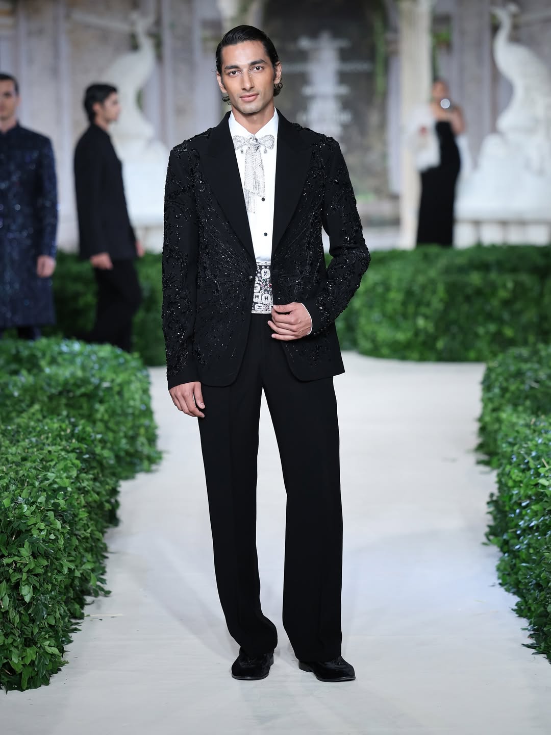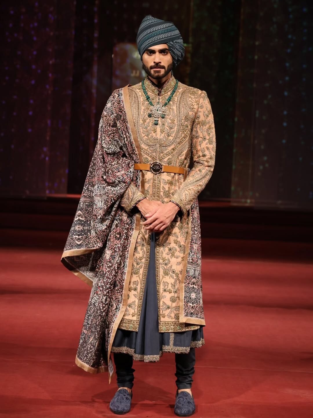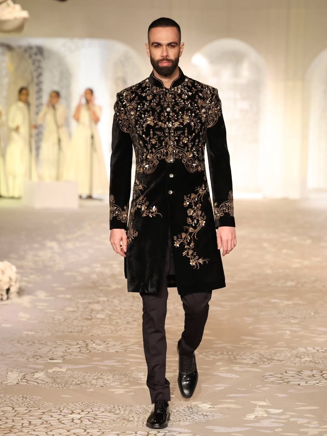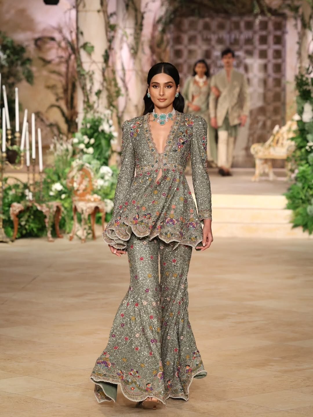 Suneet Varma’s collection Sehr bloomed with inspiration drawn from nature, featuring intricate floral embroidery across silhouettes, rendered in a romantic palette of jewel tones, soft pastels, and opulent hues like midnight blue and gold. From lehengas to sherwanis, each ensemble echoed Varma’s signature patterns and a poetic exploration of femininity.