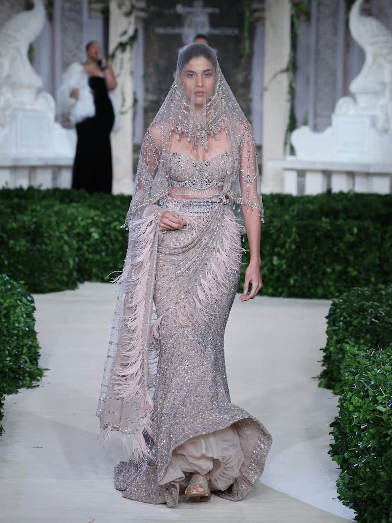Manish Malhotra made a dazzling return to India Couture Week with a couture party, swapping the traditional runway for a glamorous soirée. Bringing together the richness of tradition and the drama of couture, Malhotra’s assemblage featured form-fitting silhouettes, flowing drapes, and his hallmark corsetry. Brazilian supermodel Alessandra Ambrosio turned heads in two show-stopping looks: a pearl-encrusted corset lehenga and a silver shimmer saree set – both unmistakably Manish Malhotra.
