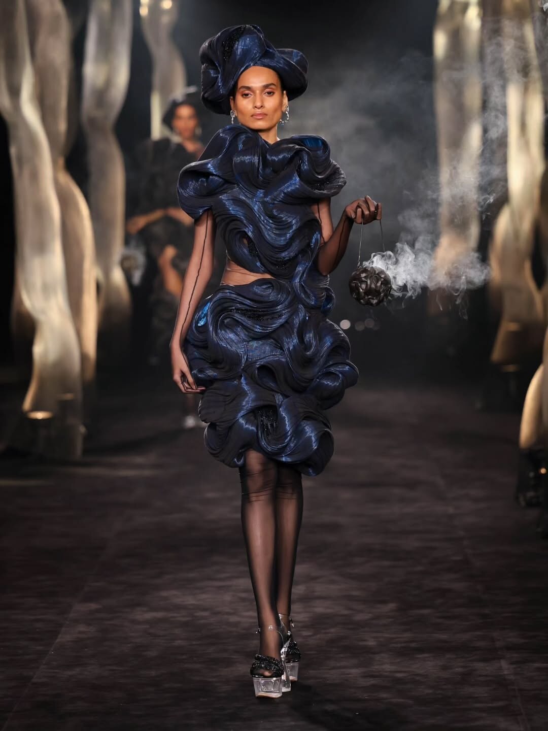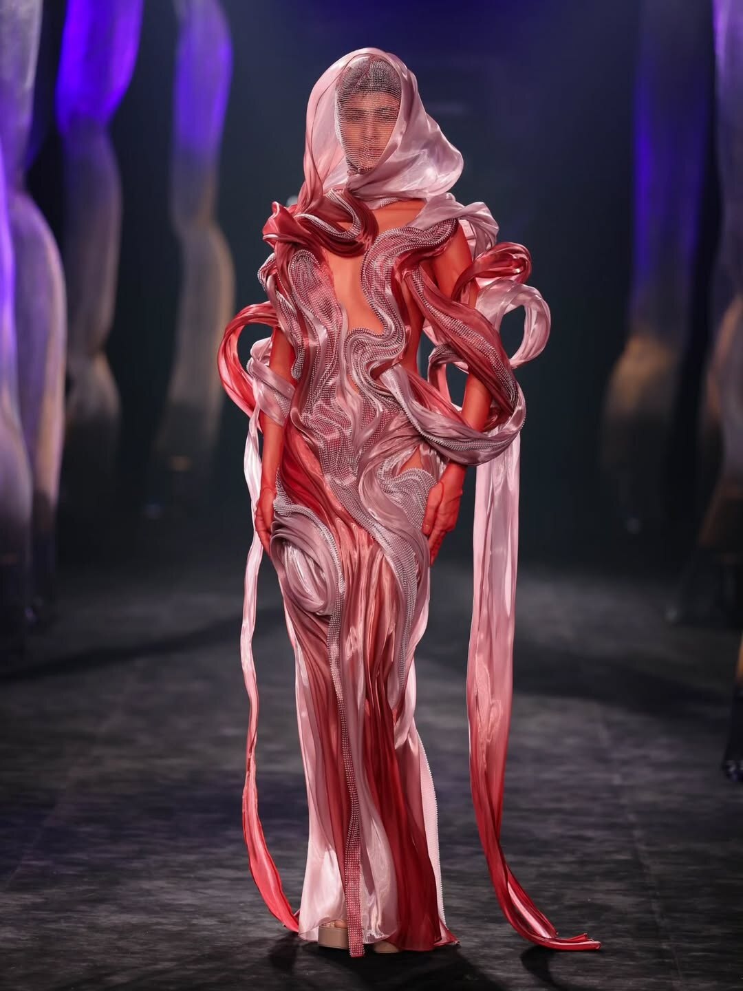 Amit Aggarwal’s Arcanum was arguably the most futuristic showcase of the season. Drawing inspiration from human biology and DNA, the collection unfolded in five conceptual chapters – Origin, Bloom, Pulse, Mutation, and Memory. Exploring sculptural forms, spirals, and layered iridescent textures, each piece pushed the boundaries of innovation and structure.