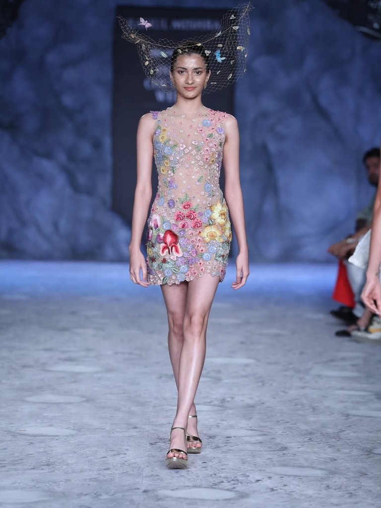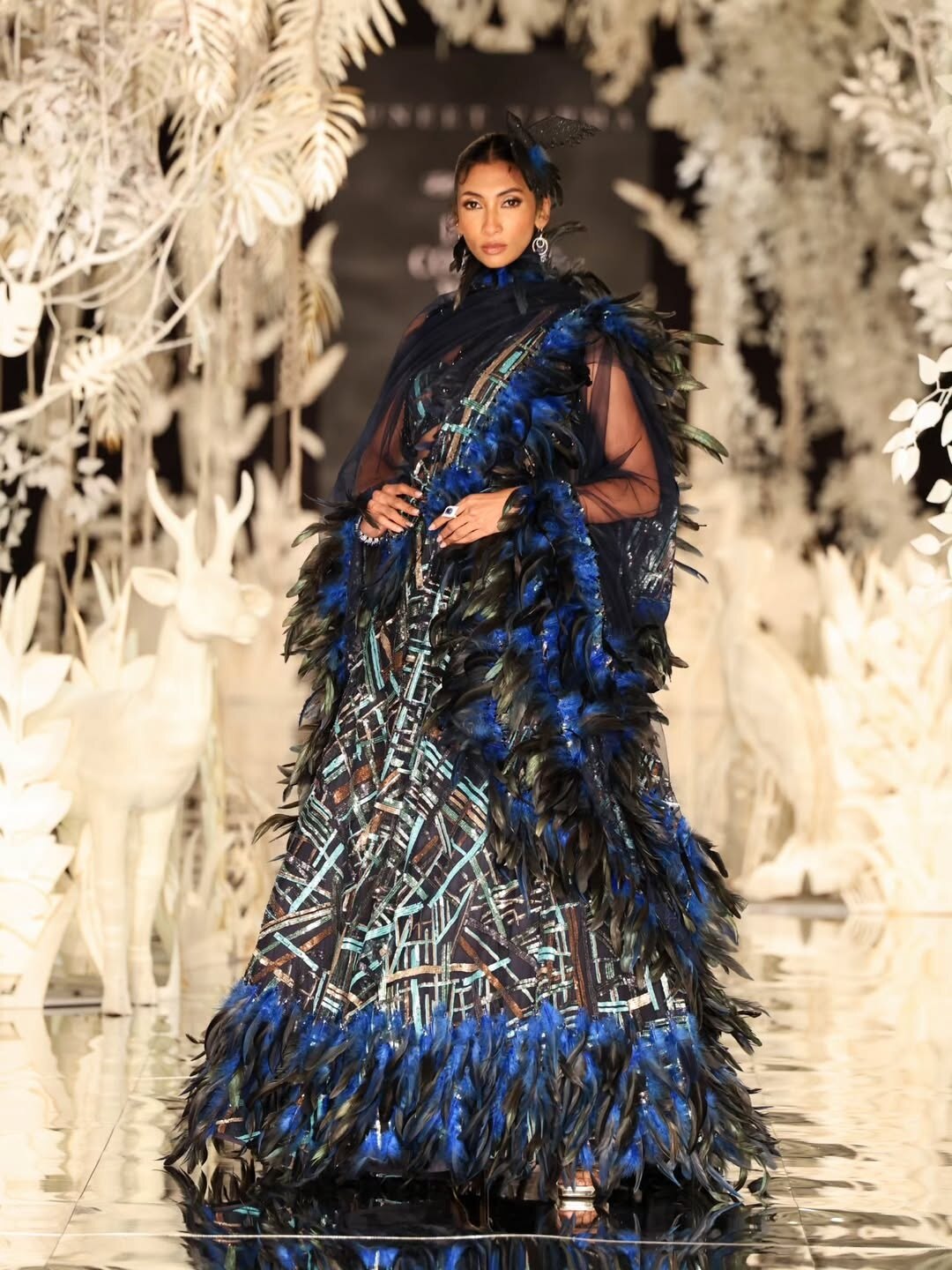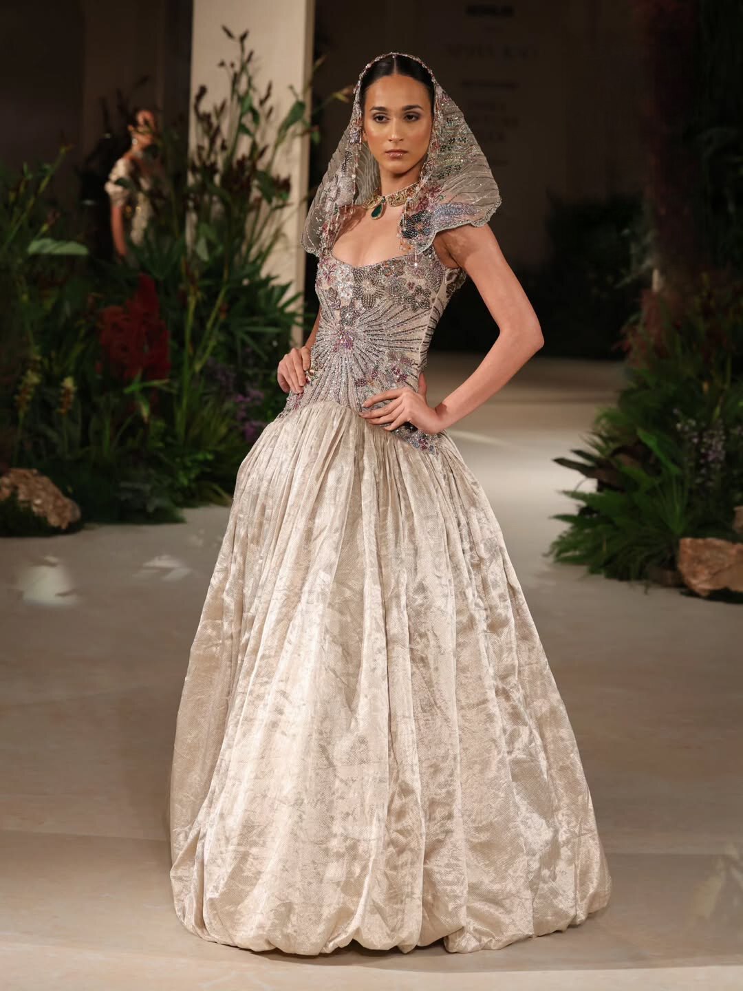Marking her India Couture Week debut, Aisha Rao brought the fantastical Wild at Heart – a maximalist ode to nature’s untamed beauty. The collection unraveled through sculpted tailoring, dense appliqué, and richly layered textures, brought to life in silhouettes that exude romance.