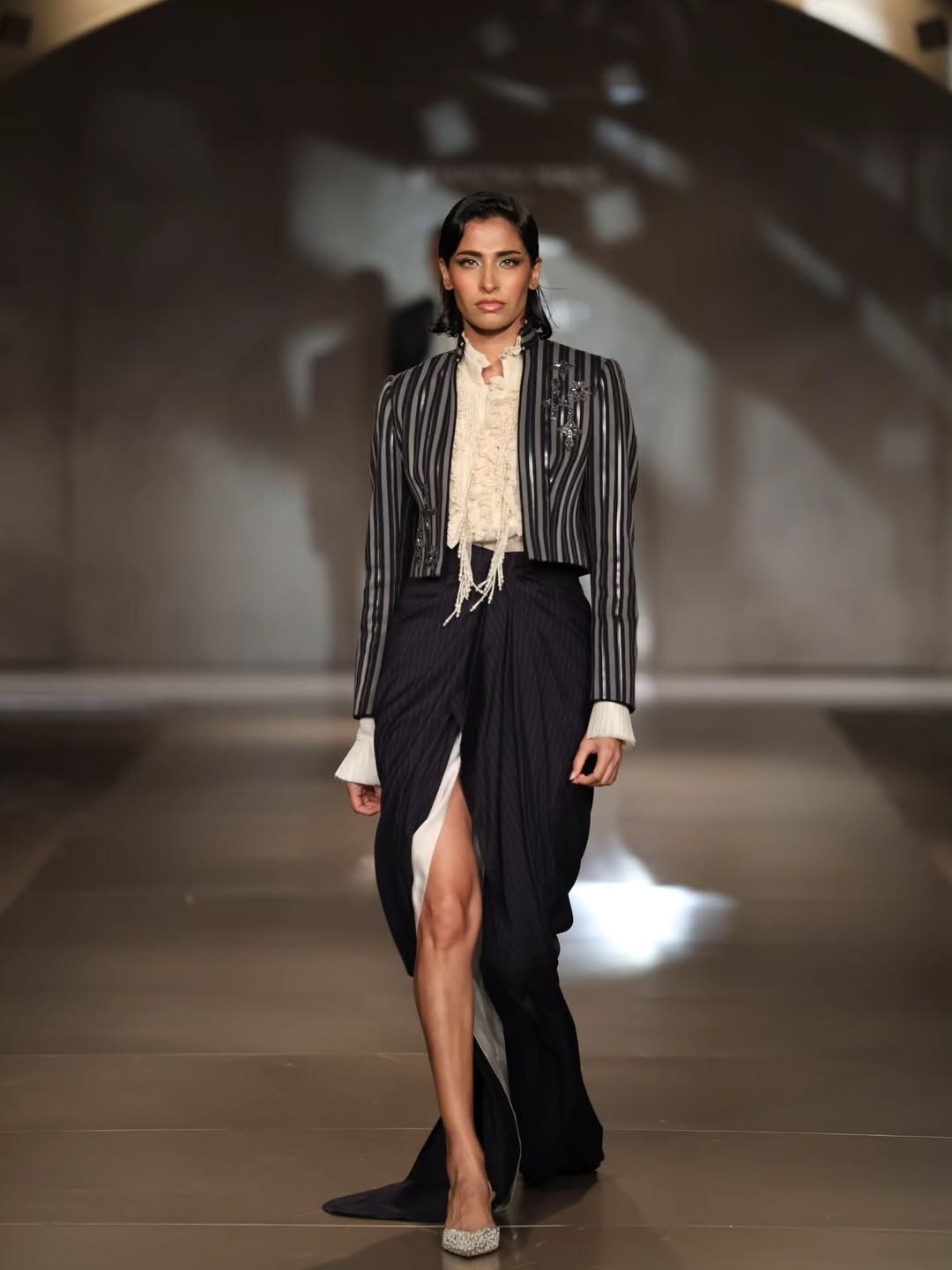 Shantnu & Nikhil brought an edgy charm to the showcase, melding military sharpness with poetic undertones. The label’s collection, Metropolis, featured structured sherwanis, crystal-studded bandhgalas, and sculpted blazers that stood alongside slit skirts and pearl-draped blouses, offering a dramatic fusion of form.